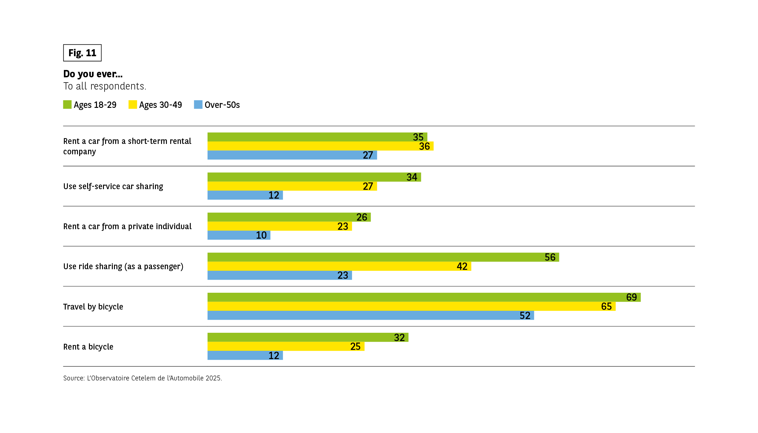 The infographic presents the responses to the question “Do you…?”, asked to the entire sample. The practices concerned are: renting a car from a short-term rental company, using a car-sharing service, renting a car from a private individual, carpooling as a passenger, traveling by bike, and renting a bike. The results are compared for three age groups: 18-29 years old, 30-49 years old, and 50 years old and over.