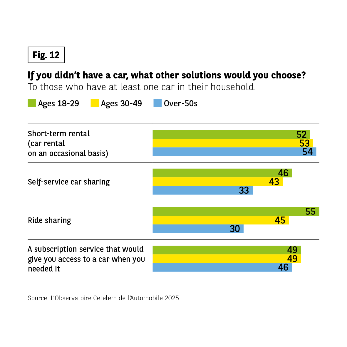 The infographic presents the responses to the question “If you didn’t have a car, what other solutions would you choose?”, asked to people who have at least one car in their household. Four solutions are proposed: short-term rental, car-sharing, carpooling, and a subscription contract allowing access to a car on demand. The results are compared for three age groups: 18-29 years old, 30-49 years old, and 50 years old and over.