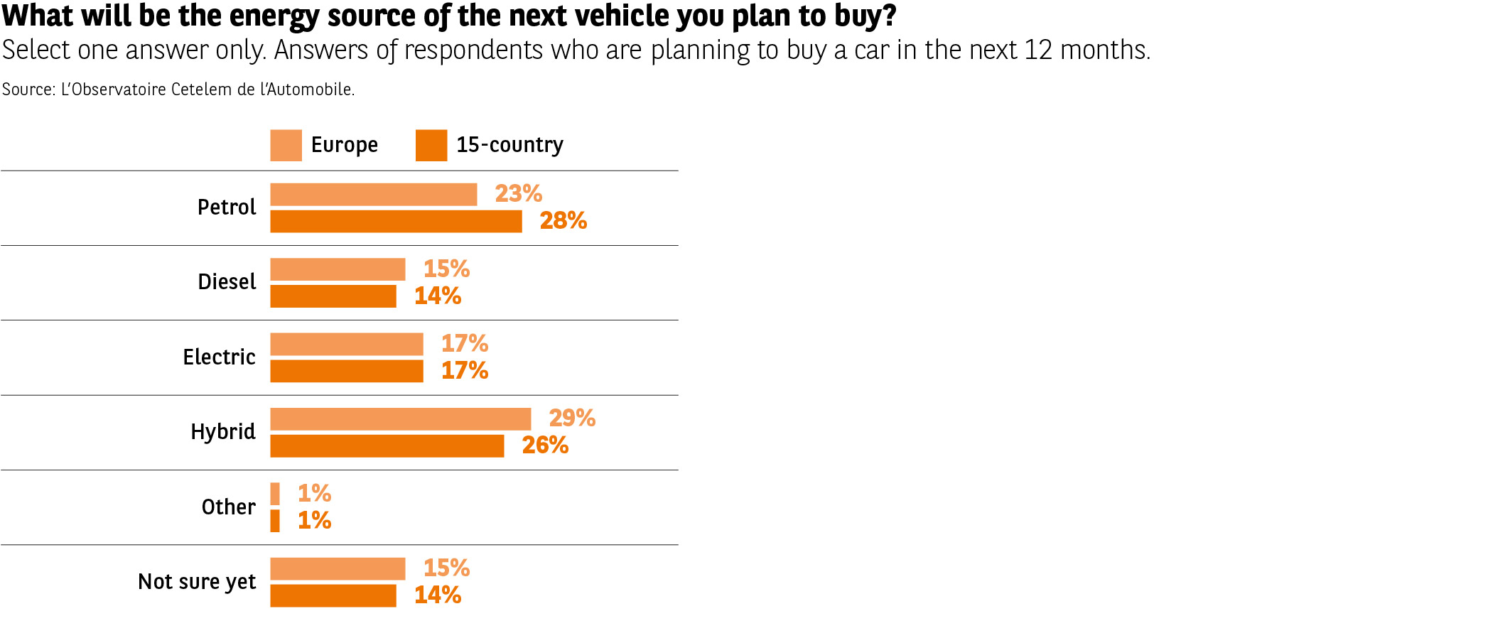 In order to bounce back and enjoy a long and fruitful relationship with motorists, the automotive sector must have no hesitation in going green. Almost half of those surveyed say that their next car will be hybrid or electric (Fig. 44). The Spanish are by far the most enthusiastic about the former, with 42% considering buying such a vehicle. The Chinese and British are the keenest to switch to electric (27% and 28%). The Dutch and South Africans are the most likely to prefer petrol (43% and 44%). The Turks are almost alone in supporting diesel in significant numbers (28%).