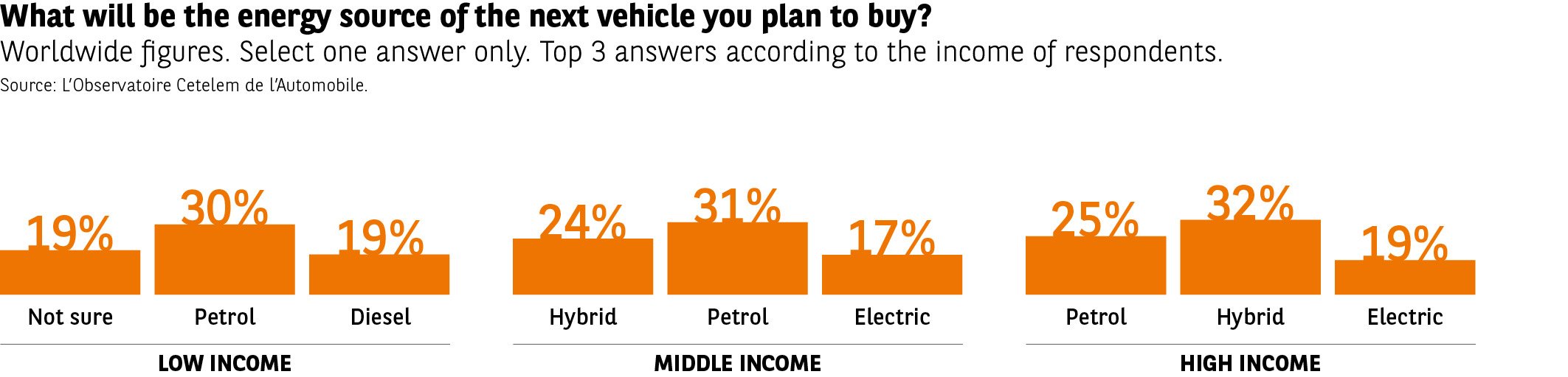 A close analysis reveals significant differences between the income groups (Fig. 45). The intentions of the wealthiest individuals are more “eco-compatible” than those on low or middle incomes. Petrol is still the preferred choice of the latter two categories. The higher cost of electric and hybrid vehicles is therefore still a major obstacle.