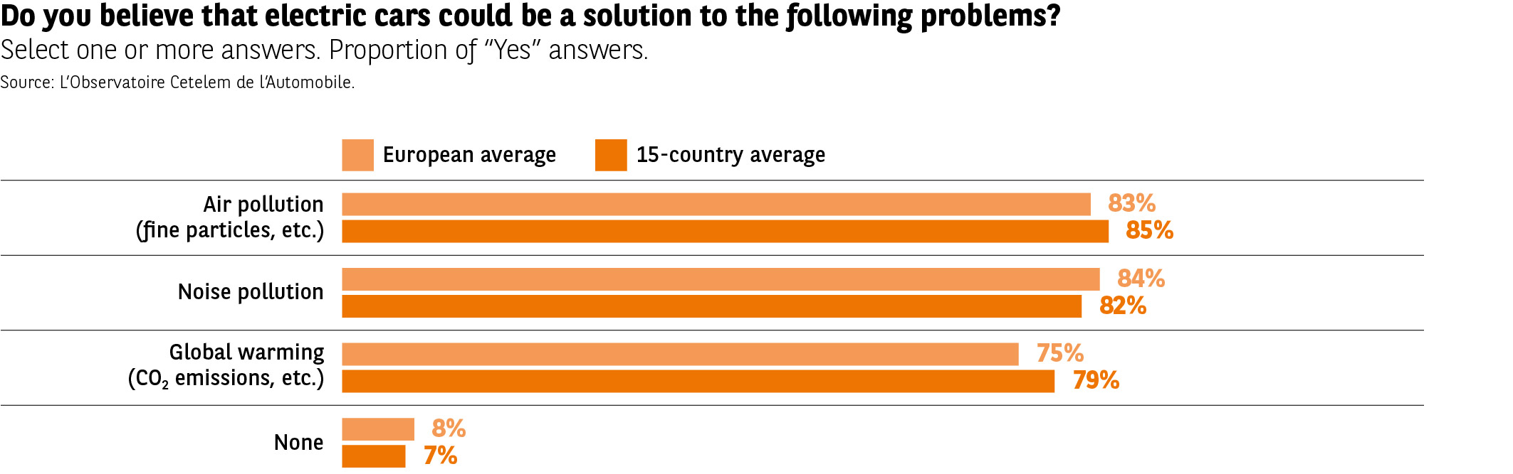 If we focus on fully-electric cars alone, the majority of people view them as an ideal solution with which to combat a wide range of environmental problems. The issues cited in particular are noise pollution, air pollution and climate change (82, 85%, 79%) (Fig. 47).