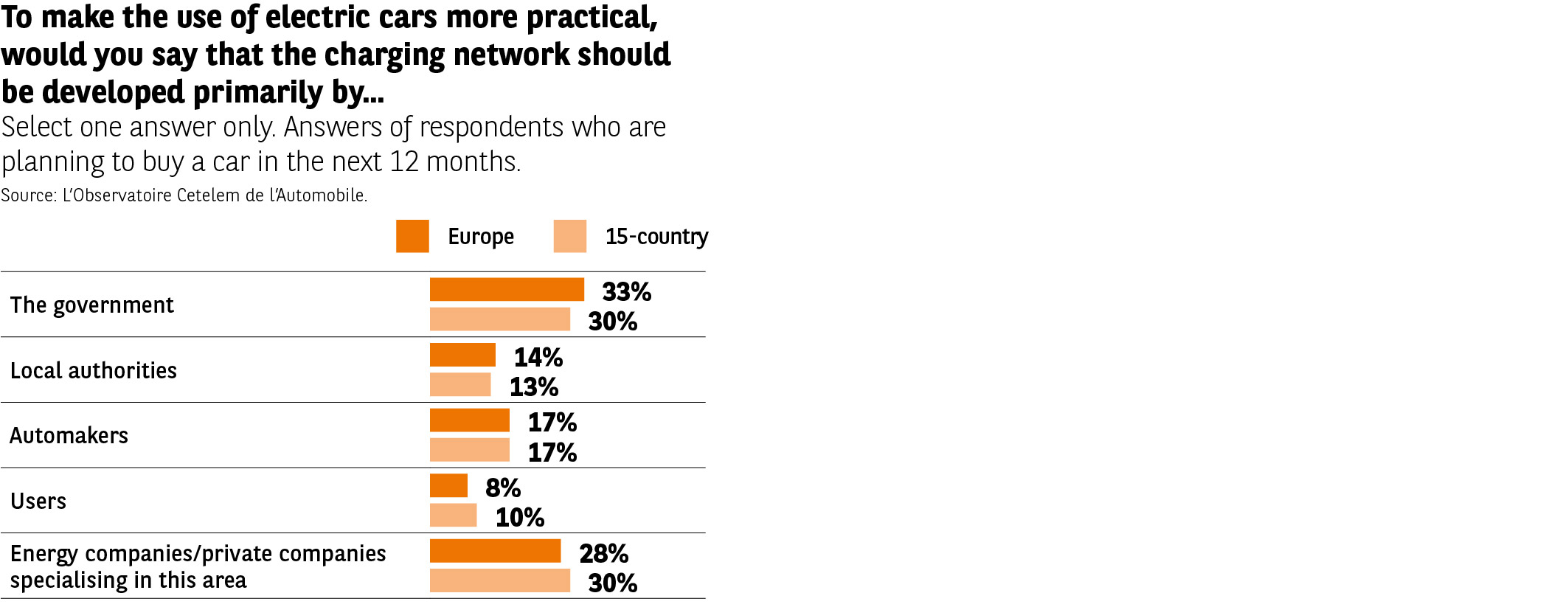 As we have seen, people are looking to governments to support the automotive industry, but not at any price. The same goes for expanding the network of charging stations, which is currently an Achilles heel for the development of this technology, together with the cost and range of vehicles. 1 in 3 people believe it is up to the authorities to drive this growth (Fig. 49). However, various other stakeholders are also expected to help pick up the reins. Almost the same proportion believe that companies from the energy sector must contribute. The rationale may be that these firms should start giving back what they have taken from the planet to help ensure a more sustainable future.
