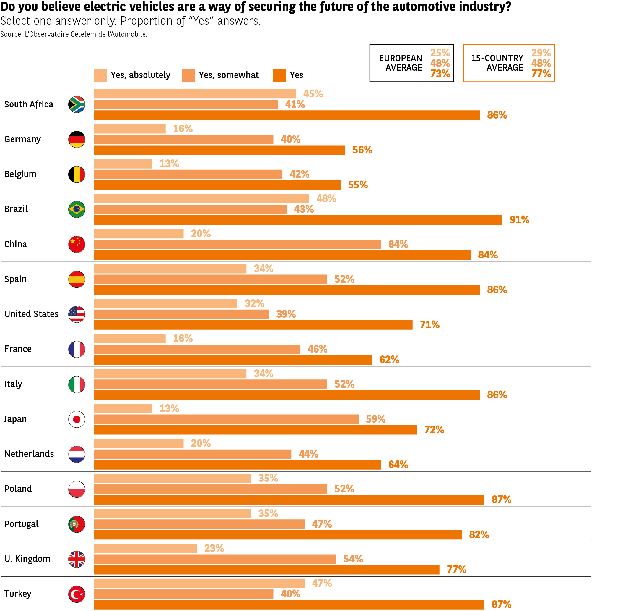 A final leap forward was apparently needed for electric cars to be considered the auto industry’s guiding light towards a bright future. Today, this leap has resolutely been made. 3 in 4 state that these vehicles will secure the sector’s future (Fig. 51). Electric power is largely viewed as the only magic wand available. On this question, which is fundamentally tied to government environmental policies, we find the same difference of opinion already observed in many areas. Indeed, while the emerging countries and China passionately believe in the idea, France, Germany and Belgium are a little less convinced.