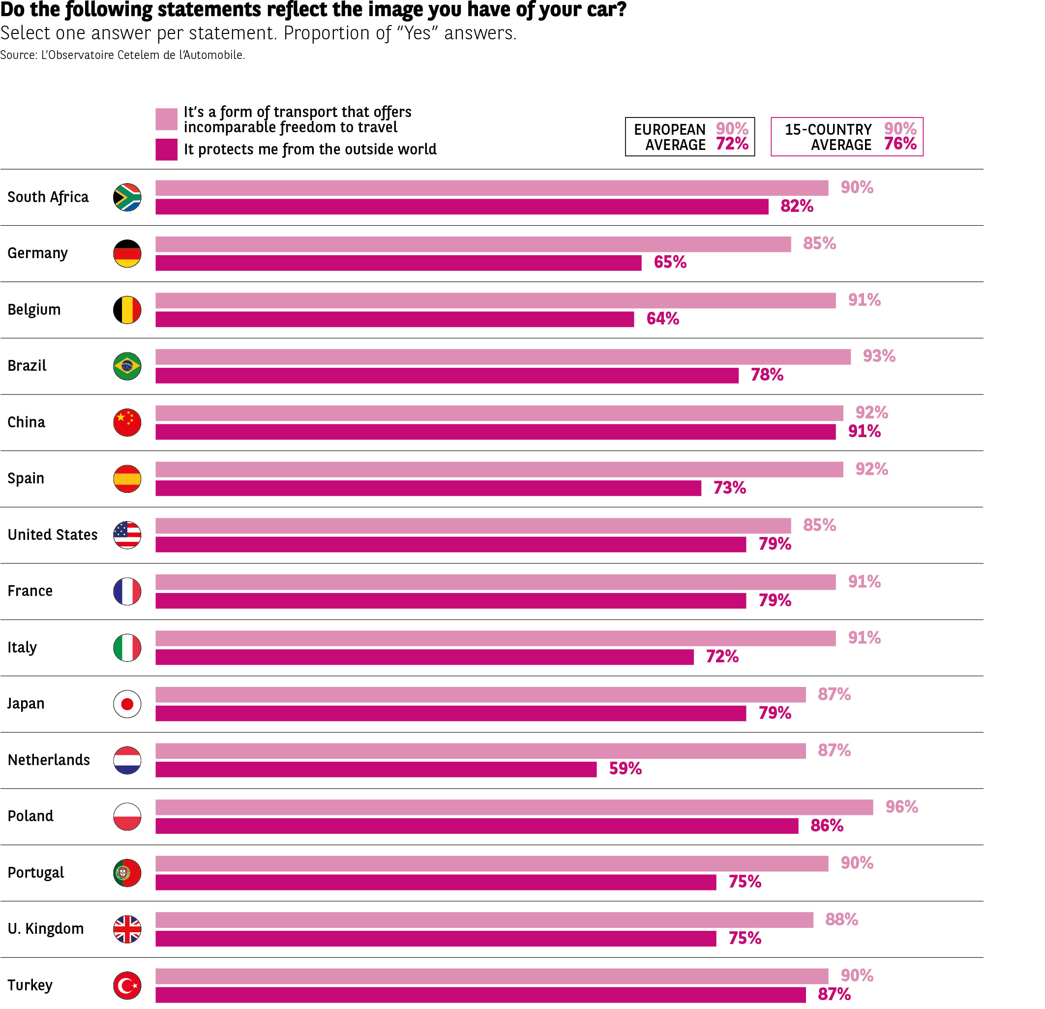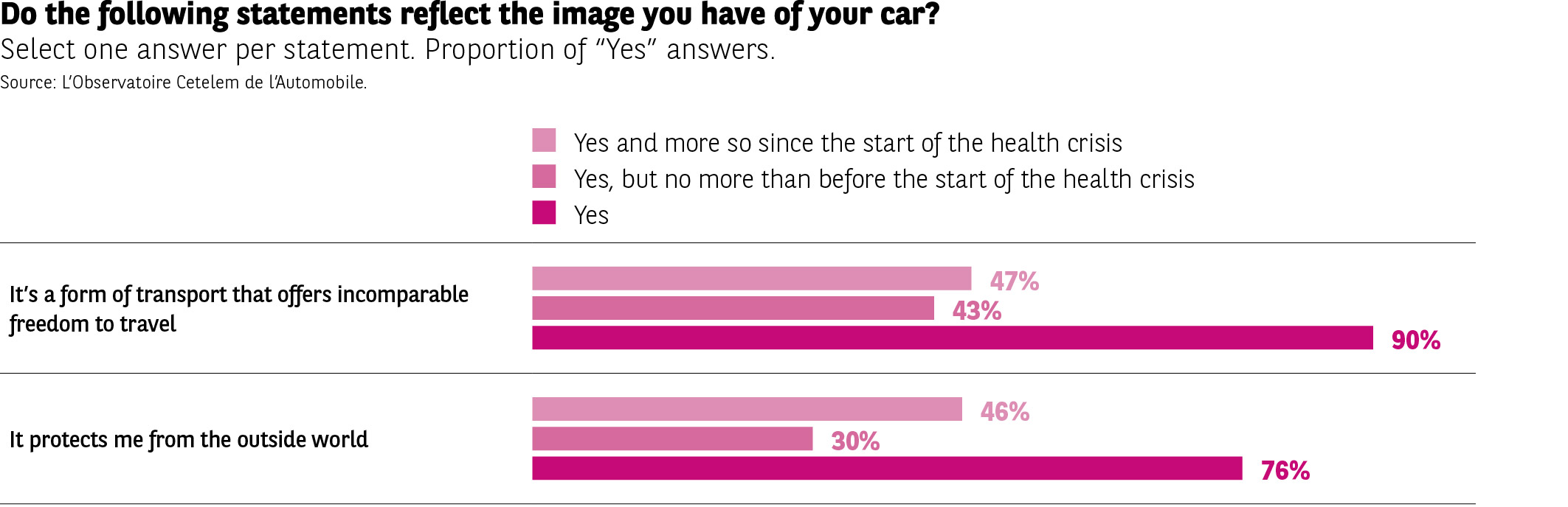 So they represent freedom, but they also serve as a place of refuge. Indeed, 76% say that when they are in their car they feel protected from the outside world. Again, this is a feeling that has intensified over the course of the crisis according to 46% of respondents.