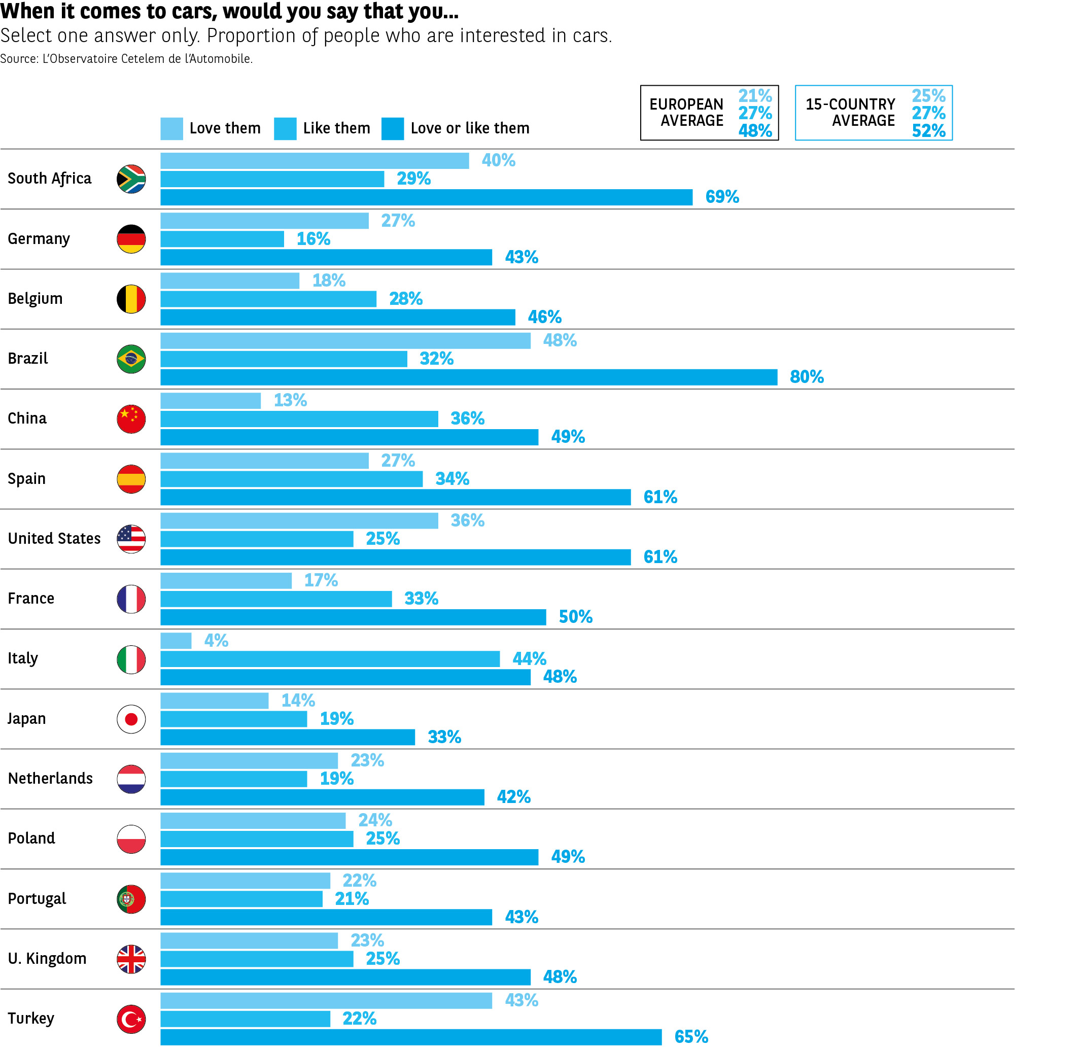 Although 1 in 2 people say they are interested in cars, this interest is more likely to be driven by reason than passion. Only a quarter of those surveyed say that they really love cars and motoring (Fig. 14). These enthusiasts are most likely to be found in Turkey, South Africa and Brazil (43%, 40% and 48%), countries conquered by motor vehicles relatively recently, but also in the United States, where the car is king (36%). Conversely, in China and Italy passions do not run as high. With only 4% declaring that they love cars, the Italians dispel the stereotype that they are passionate about beautiful mechanical creations. We should also underline that, overall, such passion has a price or, rather, is contingent on a high income. The most affluent households are almost twice as likely to describe themselves as car lovers than those with the lowest incomes (32% vs. 19%).
