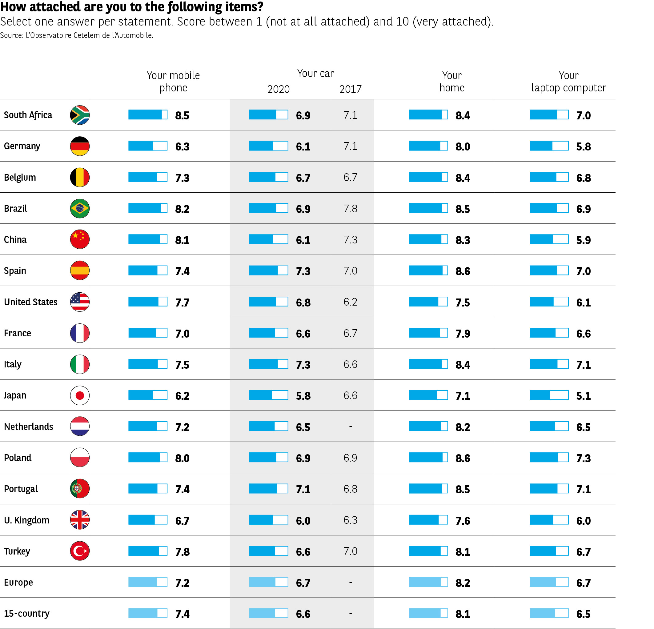 While cars may fuel fewer dreams today, our attachment to them is still relatively strong. This attachment has remained constant over time. In L’Observatoire Cetelem 2017 (“I love my car”), the average attachment score respondents assigned to cars was 6.7. Four years later, it is practically identical: 6.6 worldwide and 6.7 in Europe, with those in Latin countries being the fondest of their vehicles (Fig. 15). However, cars are no longer people’s “favourite”, as they were in the past. They are invariably surpassed by mobile phones, an inescapable, indispensable and unparalleled product in the modern world (8.1 worldwide, 8.2 in Europe). The income factor reveals a very clear disparity between the wealthy, who are very attached to their cars (7.4), and lower income individuals, whose attachment is weaker (5.9). The monetary and use value of a vehicle go some way to explaining this difference.