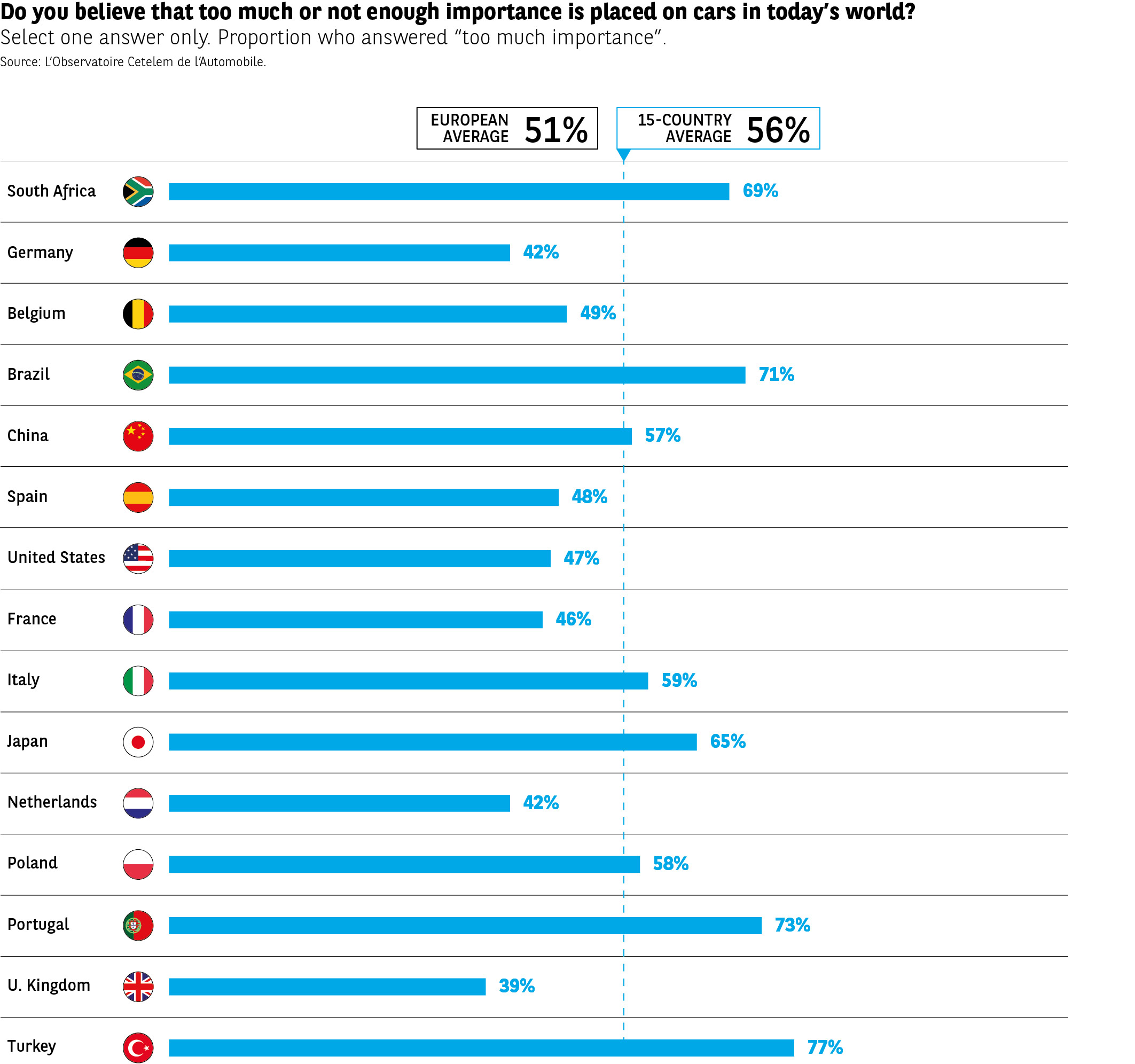 Are cars seeing their lustre fade? What is certain is that their relative status in an economic world that is shifting from the industrial to the digital is now seen as too high. More than 1 in 2 people are of this view, but the disparities are considerable. In the emerging countries, where the automotive market has gained importance more recently, but also in Portugal and Japan, its status is viewed as overblown, with 8 out of 10 Turks also being of this opinion (Fig. 16). Meanwhile, in those countries whose relationship with the automobile is longer standing, this view is less prevalent (39%, 42% and 46% in the United Kingdom, Germany and France). In the Netherlands, a figure of 42% highlights a reluctance to heap scorn on cars, even though they often play second fiddle to bicycles in the country.