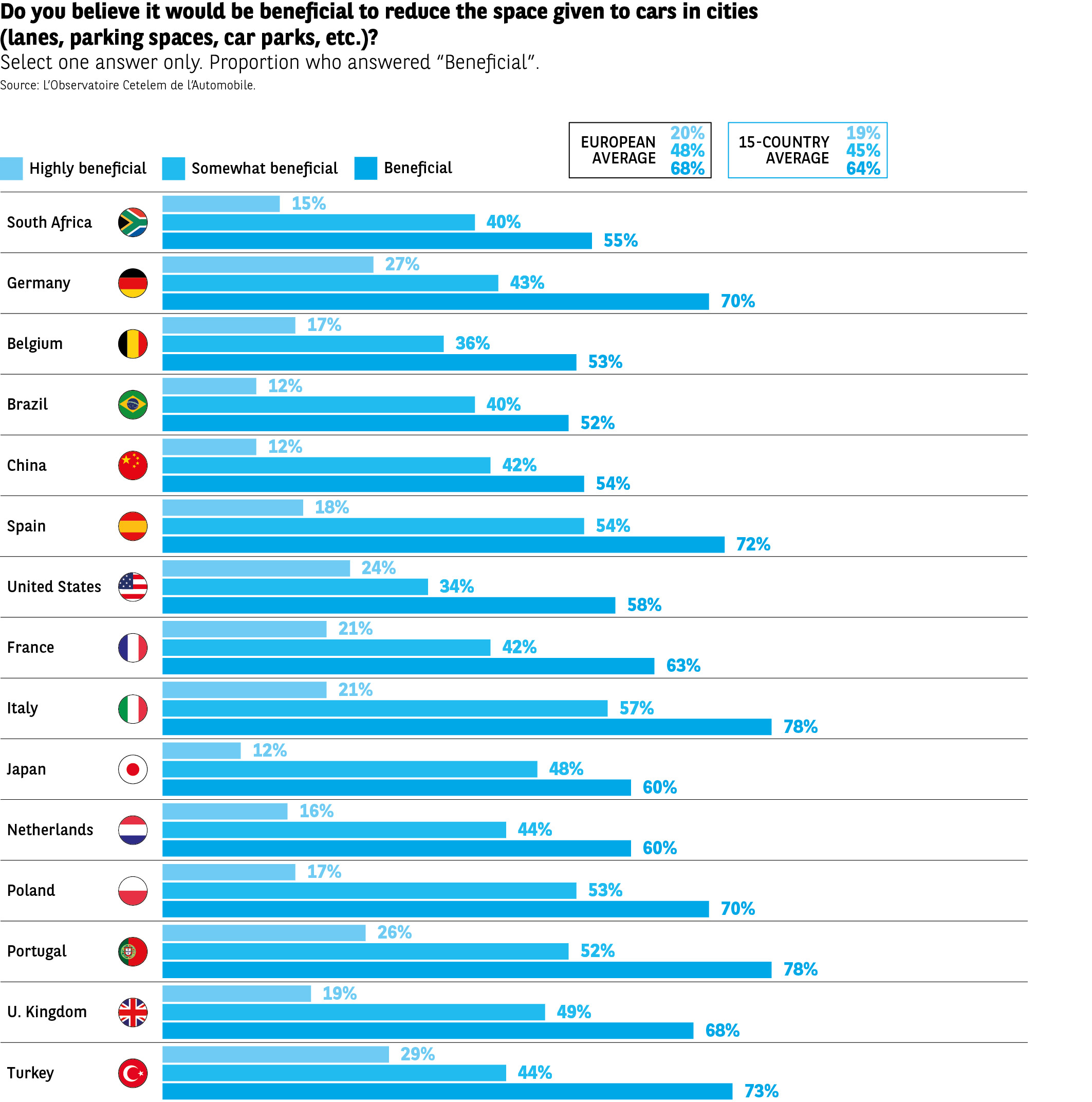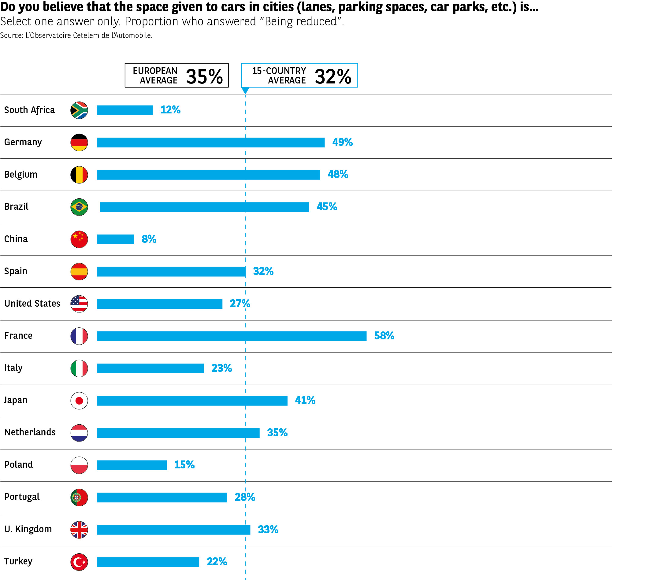 While there is a belief that too much importance is placed on cars, they are slowly fading from the landscape in the eyes of those surveyed. In particular, one-third believe that their presence in cities is falling and that more space is being freed up through a reduction in the number of lanes, parking spaces and car parks (Fig. 17). On this issue, those countries in which Green parties have the most influence, both nationally and locally, are the most forthright. 6 out of 10 French citizens and 1 in 2 Germans and Belgians bear witness to a gradual exodus of vehicles from cities. Conversely, just 1 in 10 Chinese share this feeling. The congestion caused by vehicles in the megacities of the Middle Kingdom does not seem set to ease any time soon.