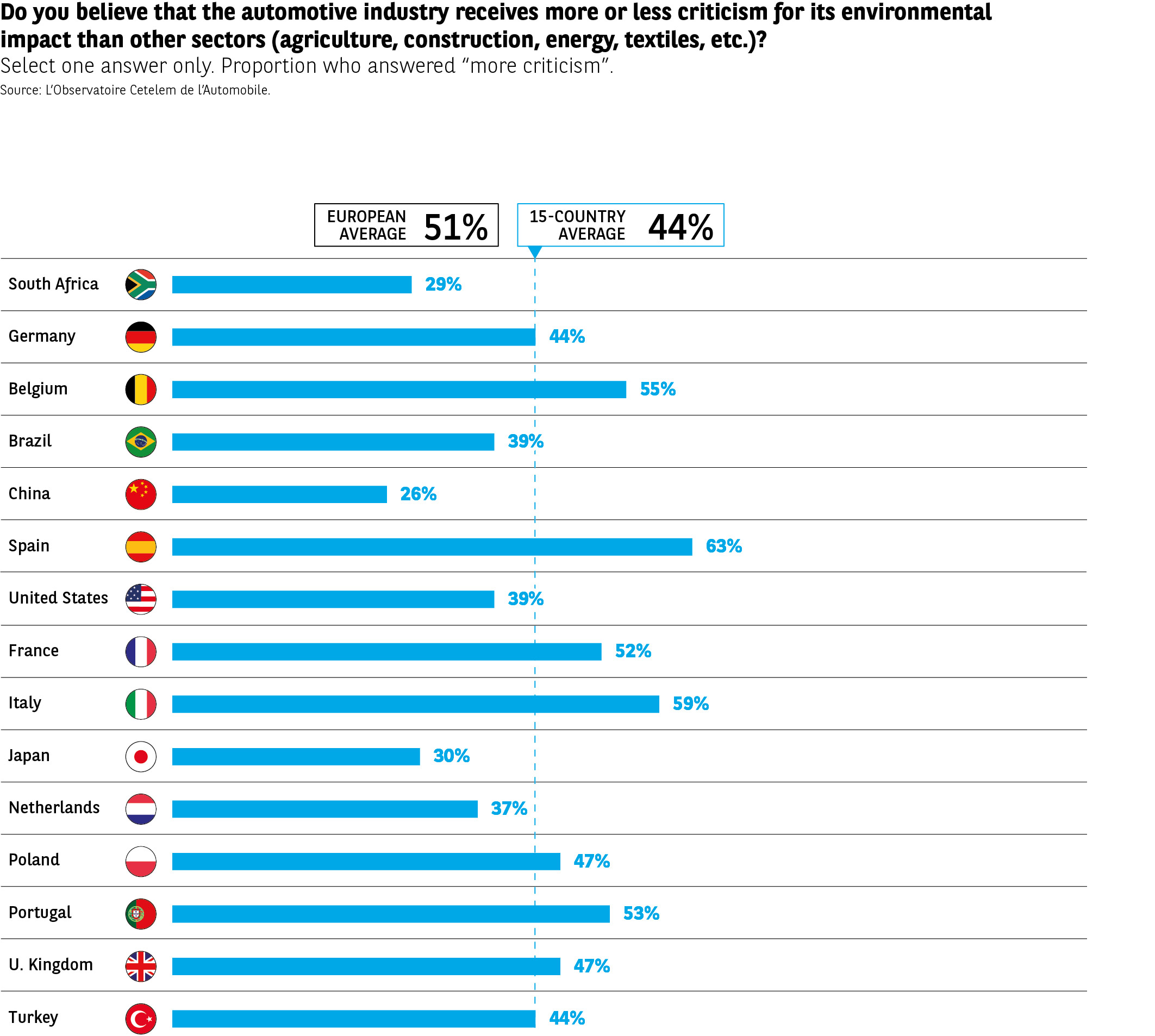 However, 1 in 2 people in Europe (44% worldwide) (Fig. 12) believe that motor vehicles receive more criticism in this respect than sectors such as construction, agriculture and other forms of transport. Inhabitants of European Union countries, who are probably more mature and better informed when it comes to environmental issues, are more likely to be of this opinion (63% in Spain, 59% in Italy). At the opposite end of the spectrum, the Chinese are quicker to blame urban pollution on cars than on industry, with only a small proportion sharing the view that the auto industry is unfairly criticised (26%).