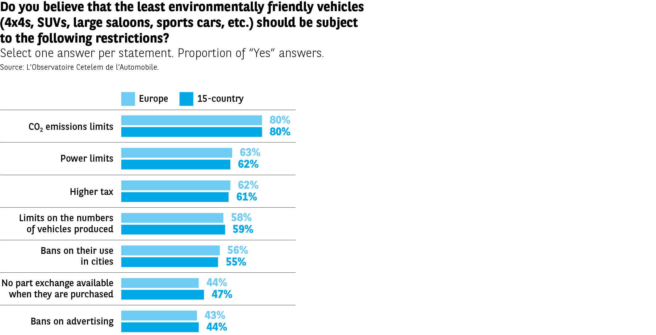 Two final measures are popular among more than half of those surveyed. Restricting production of the least environmentally-friendly vehicles (59%). Prohibiting these same vehicles from entering cities (55%). Once again, the Chinese and Turks head the field of those who support these solutions. It should be noted that France ranks third on every measure put forward.