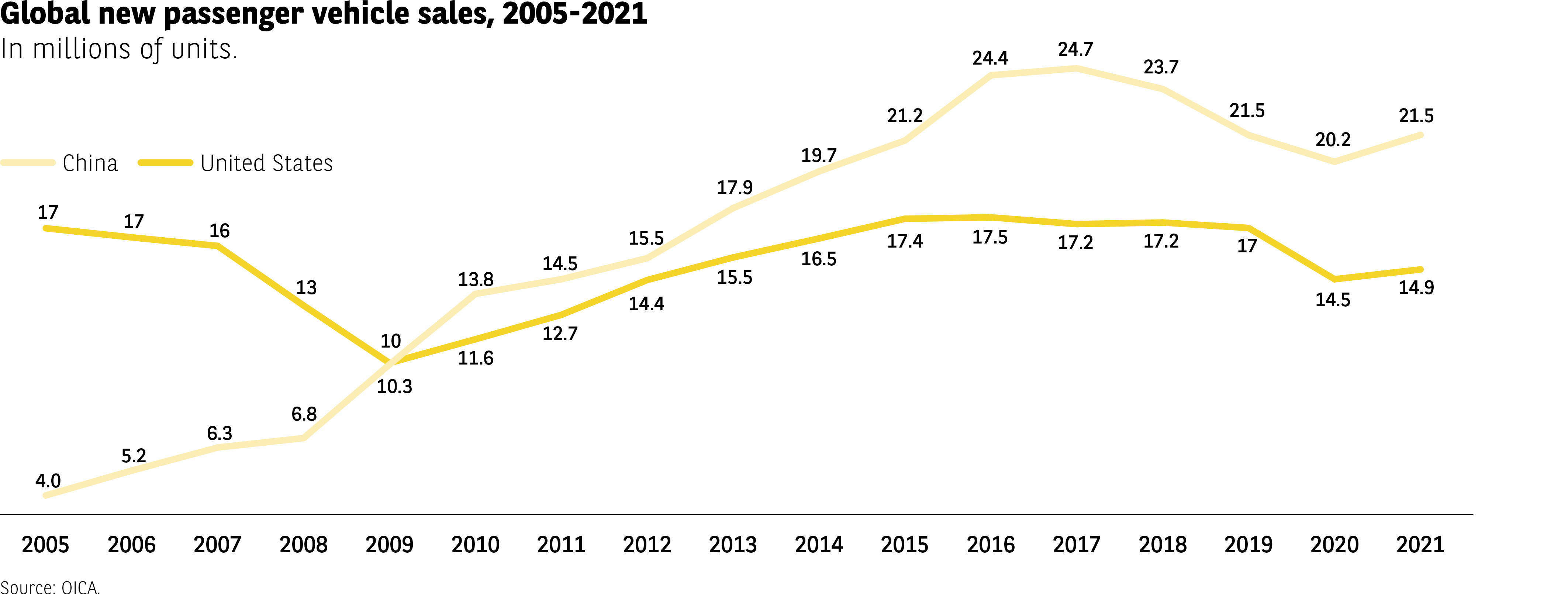 Fig 2 – New vehicle sales in China and the United States from 2005 to 2021