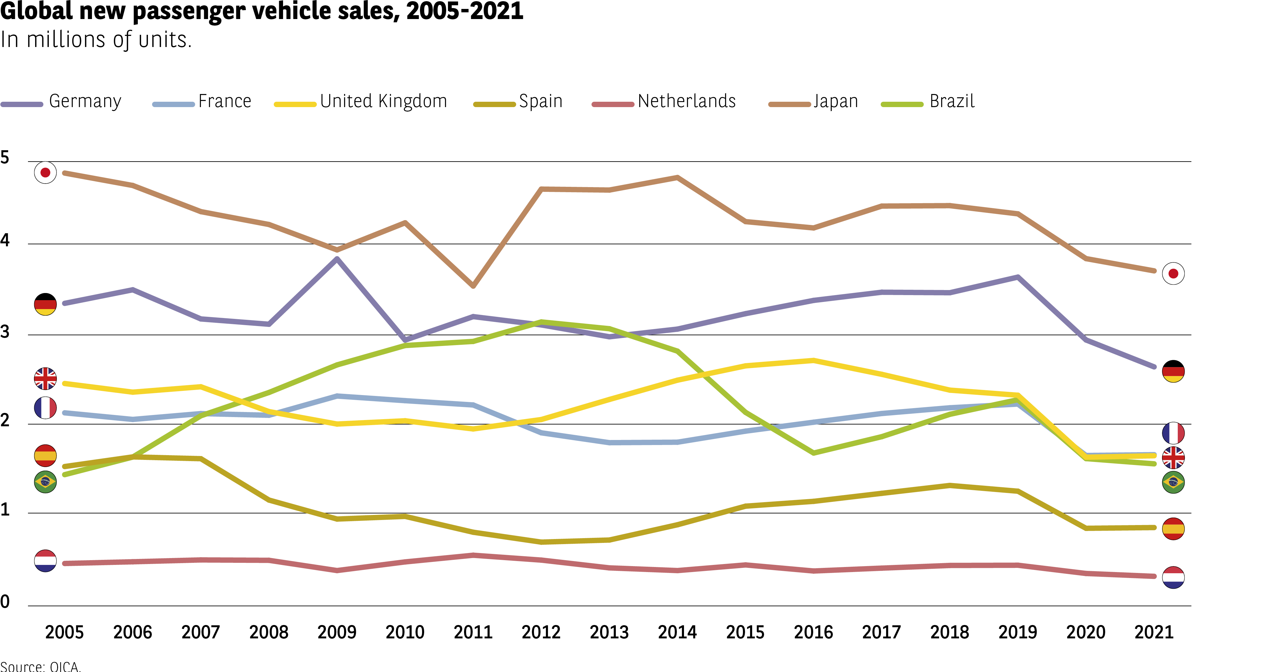 Compare the 2005-2021 evolution of new car sales in Germany, France, United Kingdom, Spain, Netherlands, Japan and Brazil The infographic shows annual sales of new passenger vehicles, in millions of units, between 2005 and 2021 for seven countries: Germany, France, the United Kingdom, Spain, the Netherlands, Japan, and Brazil. Country data (in millions of units): Japan 2005: 4.8 2006: 4.7 2007: 4.4 2008: 4.1 2009: 3.9 2010: 4.2 2011: 4.4 2012: 4.4 2013: 4.6 2014: 4.7 2015: 4.2 2016: 4.1 2017: 4.4 2018: 4.3 2019: 4.0 2020: 3.7 2021: 3.8 Germany 2005: 3.3 2006: 3.5 2007: 3.1 2008: 3.1 2009: 3.8 2010: 3.2 2011: 3.3 2012: 3.1 2013: 3.0 2014: 3.2 2015: 3.2 2016: 3.3 2017: 3.4 2018: 3.4 2019: 3.6 2020: 2.9 2021: 2.6 United Kingdom 2005: 2.4 2006: 2.3 2007: 2.4 2008: 2.1 2009: 2.0 2010: 2.1 2011: 1.9 2012: 1.9 2013: 2.3 2014: 2.5 2015: 2.6 2016: 2.7 2017: 2.5 2018: 2.4 2019: 2.3 2020: 1.6 2021: 1.7 France 2005: 2.1 2006: 2.0 2007: 2.1 2008: 2.0 2009: 2.1 2010: 2.3 2011: 2.2 2012: 2.0 2013: 1.8 2014: 1.8 2015: 1.9 2016: 2.0 2017: 2.1 2018: 2.2 2019: 2.2 2020: 1.7 2021: 1.7 Brazil 2005: 1.4 2006: 1.8 2007: 2.2 2008: 2.4 2009: 2.6 2010: 3.0 2011: 3.1 2012: 3.0 2013: 3.0 2014: 2.8 2015: 2.5 2016: 2.0 2017: 2.1 2018: 2.3 2019: 2.1 2020: 1.7 2021: 1.6 Spain 2005: 1.5 2006: 1.6 2007: 1.6 2008: 1.2 2009: 1.1 2010: 0.9 2011: 0.8 2012: 0.7 2013: 0.7 2014: 0.9 2015: 1.0 2016: 1.1 2017: 1.2 2018: 1.2 2019: 1.3 2020: 0.9 2021: 0.9 Netherlands 2005: 0.5 2006: 0.5 2007: 0.5 2008: 0.4 2009: 0.5 2010: 0.6 2011: 0.6 2012: 0.5 2013: 0.4 2014: 0.4 2015: 0.4 2016: 0.4 2017: 0.4 2018: 0.4 2019: 0.4 2020: 0.3 2021: 0.3 Japan remains the largest market in the group throughout the period, though on a general downward trend. Germany is second, stable around 3 to 3.5 million units until 2019, then declining. The UK and France display similar volumes (1.8 to 2.6 million units), with a sharp drop in 2020. Brazil grows rapidly until 2010, then declines steadily after 2014. Spain drops sharply from 2007 to 2013 before recovering moderately. The Netherlands remain around 0.4–0.6 million units, with a gradual decline at the end. Source: OICA