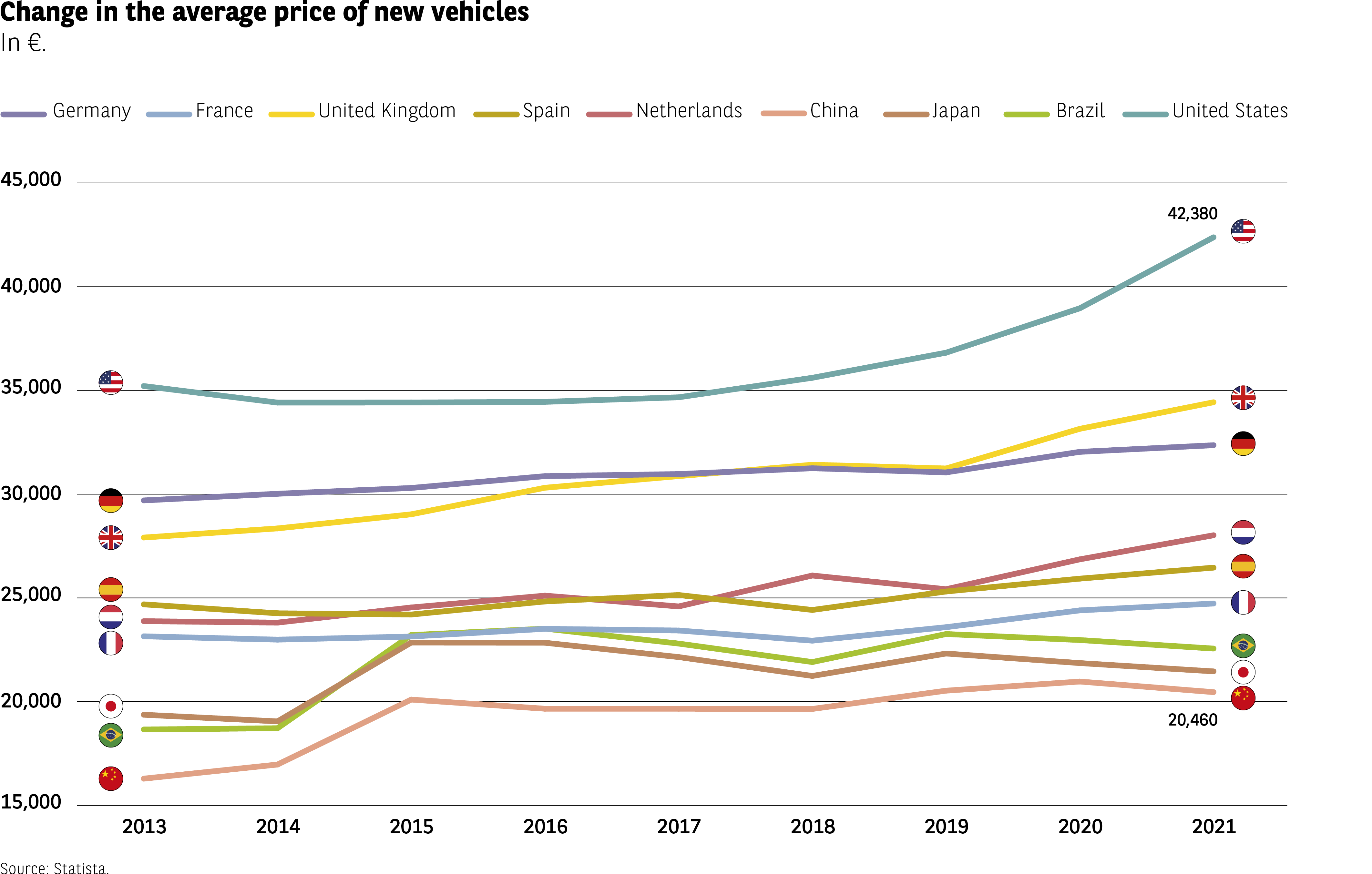 Shows changes in average new-car prices from 2013 to 2021 across ten countries, with a sharp increase in the United States. The infographic shows the evolution of the average price of new vehicles from 2013 to 2021 for ten countries: Germany, France, the United Kingdom, Spain, the Netherlands, China, Japan, Brazil, and the United States. Country data (in euros): United States 2013: 35,000 2014: 34,000 2015: 34,000 2016: 35,000 2017: 36,000 2018: 37,000 2019: 39,000 2020: 41,000 2021: 42,380 United Kingdom 2013: 27,000 2014: 28,000 2015: 29,000 2016: 30,000 2017: 30,500 2018: 30,500 2019: 31,000 2020: 33,000 2021: 34,500 Germany 2013: 29,000 2014: 29,500 2015: 30,000 2016: 30,000 2017: 30,500 2018: 30,500 2019: 31,000 2020: 31,000 2021: 32,000 France 2013: 24,500 2014: 24,000 2015: 24,000 2016: 24,000 2017: 23,000 2018: 23,500 2019: 24,000 2020: 24,000 2021: 25,000 Spain 2013: 24,000 2014: 24,000 2015: 24,500 2016: 25,000 2017: 25,000 2018: 24,000 2019: 24,000 2020: 25,000 2021: 26,000 Netherlands 2013: 23,000 2014: 23,000 2015: 24,000 2016: 25,000 2017: 24,000 2018: 25,000 2019: 26,000 2020: 27,000 2021: 27,500 Brazil 2013: 19,000 2014: 18,500 2015: 20,000 2016: 21,000 2017: 21,000 2018: 20,000 2019: 20,000 2020: 21,500 2021: 22,000 Japan 2013: 18,000 2014: 18,000 2015: 19,000 2016: 19,000 2017: 18,500 2018: 19,000 2019: 19,500 2020: 20,000 2021: 20,000 China 2013: 15,000 2014: 16,000 2015: 19,000 2016: 20,000 2017: 20,000 2018: 19,000 2019: 19,000 2020: 20,000 2021: 20,460 The United States is the country where prices increase the most over the period. European countries show a gradual but moderate rise. China and Brazil start from lower levels but increase steadily. Source: Statista