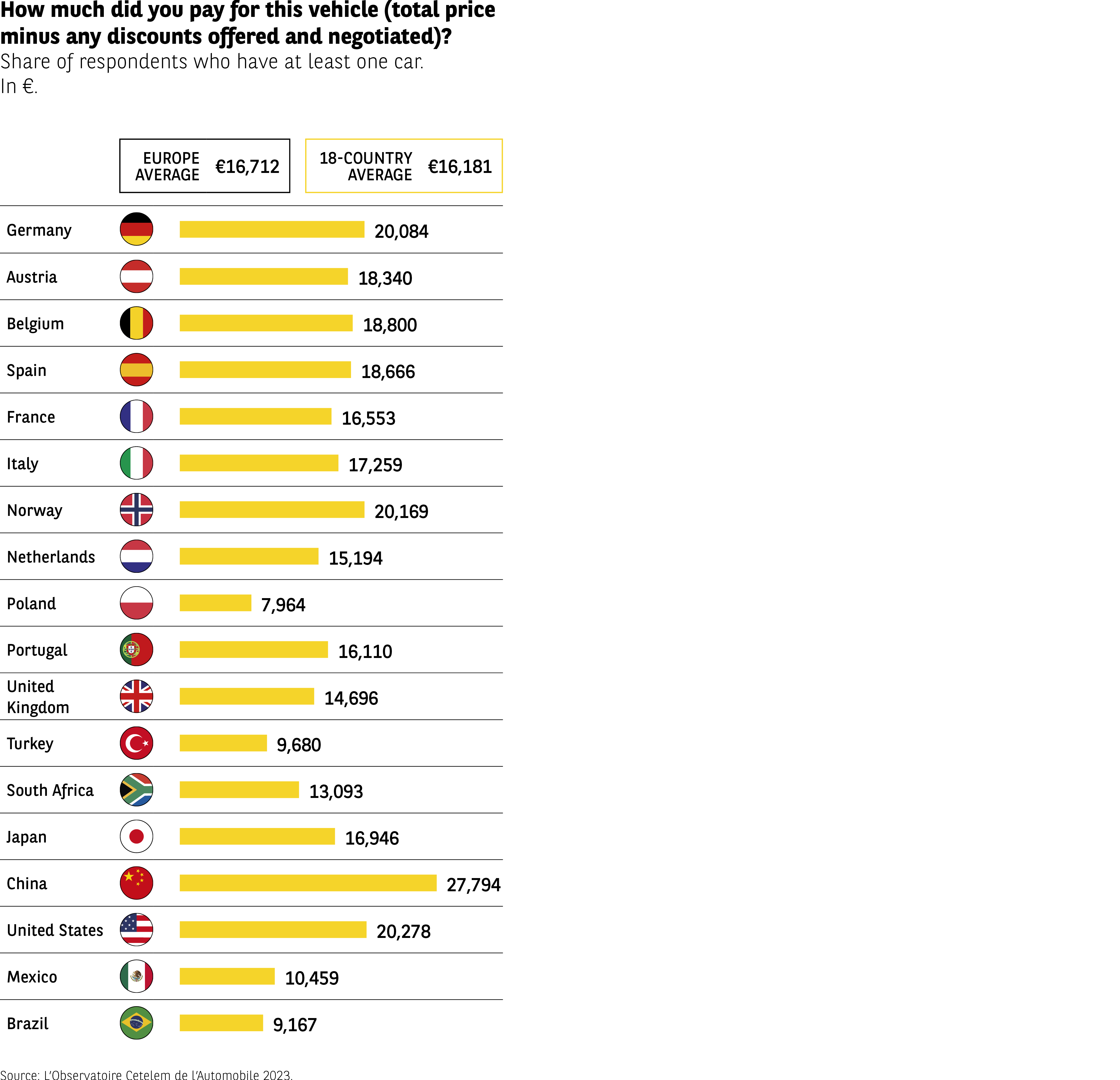 Compare the average price paid for a vehicle in 18 countries The infographic shows the actual average price paid for a vehicle (including all discounts and negotiations) across 18 countries. Reference values: – Europe average: €16,712 – Average across 18 countries: €16,181 Country data (in euros): Germany: 20,084 Austria: 18,340 Belgium: 18,800 Spain: 18,666 France: 16,553 Italy: 17,259 Norway: 20,169 Netherlands: 15,194 Poland: 7,964 Portugal: 16,110 United Kingdom: 14,696 Turkey: 9,680 South Africa: 13,093 Japan: 16,946 China: 27,794 United States: 20,278 Mexico: 10,459 Brazil: 9,167 China has the highest average price (€27,794). Poland, Brazil, and Turkey have the lowest prices. Western Europe (Germany, Belgium, Norway) is generally above both averages. Source: Observatoire Cetelem de l’Automobile 2023