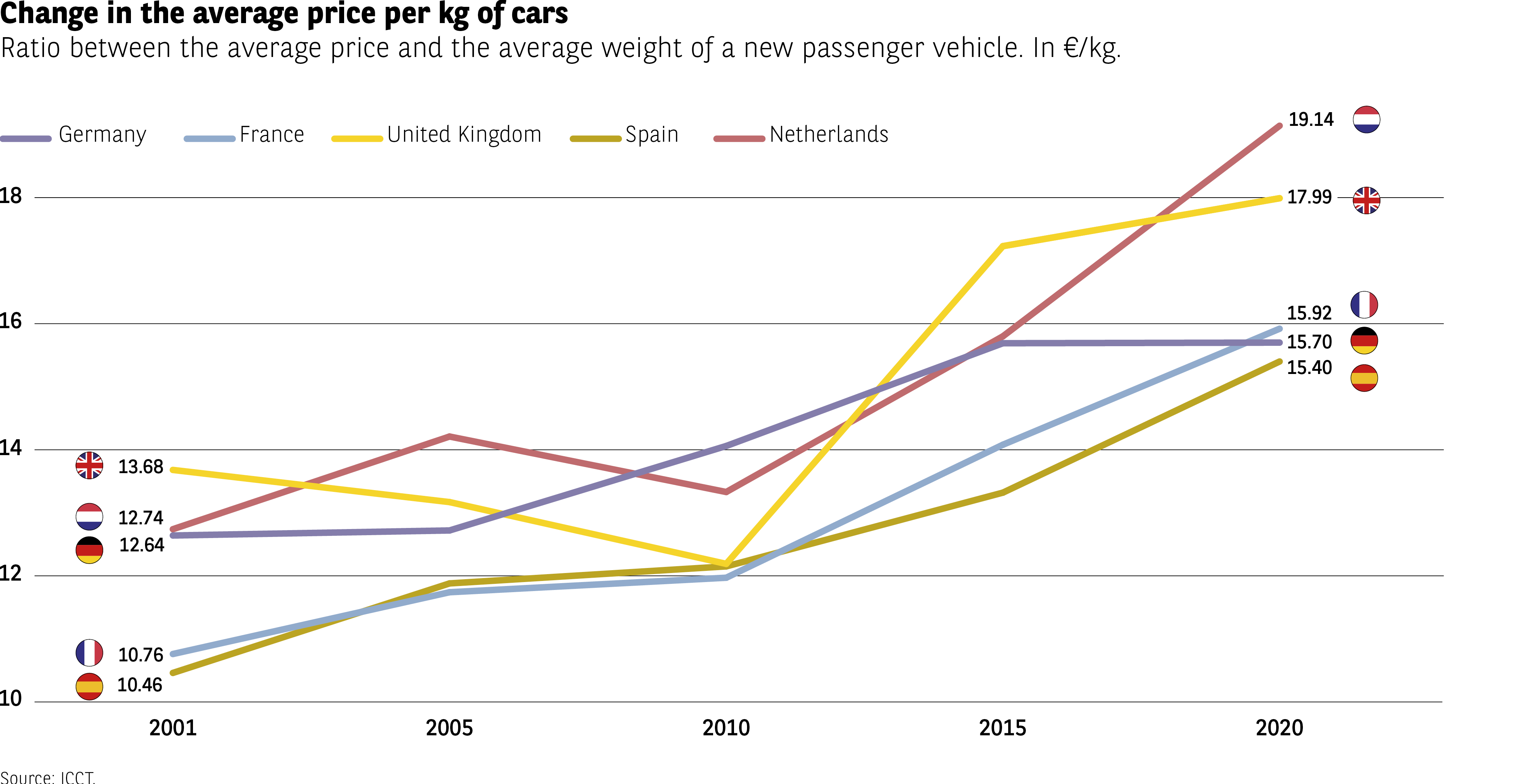 Shows the evolution of the price per kilogram of a vehicle from 2001 to 2020 in 5 countries The infographic compares the price per kilogram of a vehicle, based on the ratio between average price and average weight of a passenger car. Five countries are shown: Germany, France, the United Kingdom, Spain, and the Netherlands. Data (in €/kg) 2001 — Germany: 12.64 / France: 10.76 / UK: 13.68 / Spain: 10.46 / Netherlands: 12.74 2005 — Germany: 12.40 / France: 11.40 / UK: 12.20 / Spain: 11.20 / Netherlands: 13.80 2010 — Germany: 13.00 / France: 12.00 / UK: 11.50 / Spain: 11.80 / Netherlands: 13.00 2015 — Germany: 14.50 / France: 13.40 / UK: 14.00 / Spain: 13.20 / Netherlands: 14.80 2020 — Germany: 15.70 / France: 15.92 / UK: 17.99 / Spain: 15.40 / Netherlands: 19.14 All countries show an increase over 20 years. The Netherlands and the United Kingdom show the strongest rises. Source: ICCT