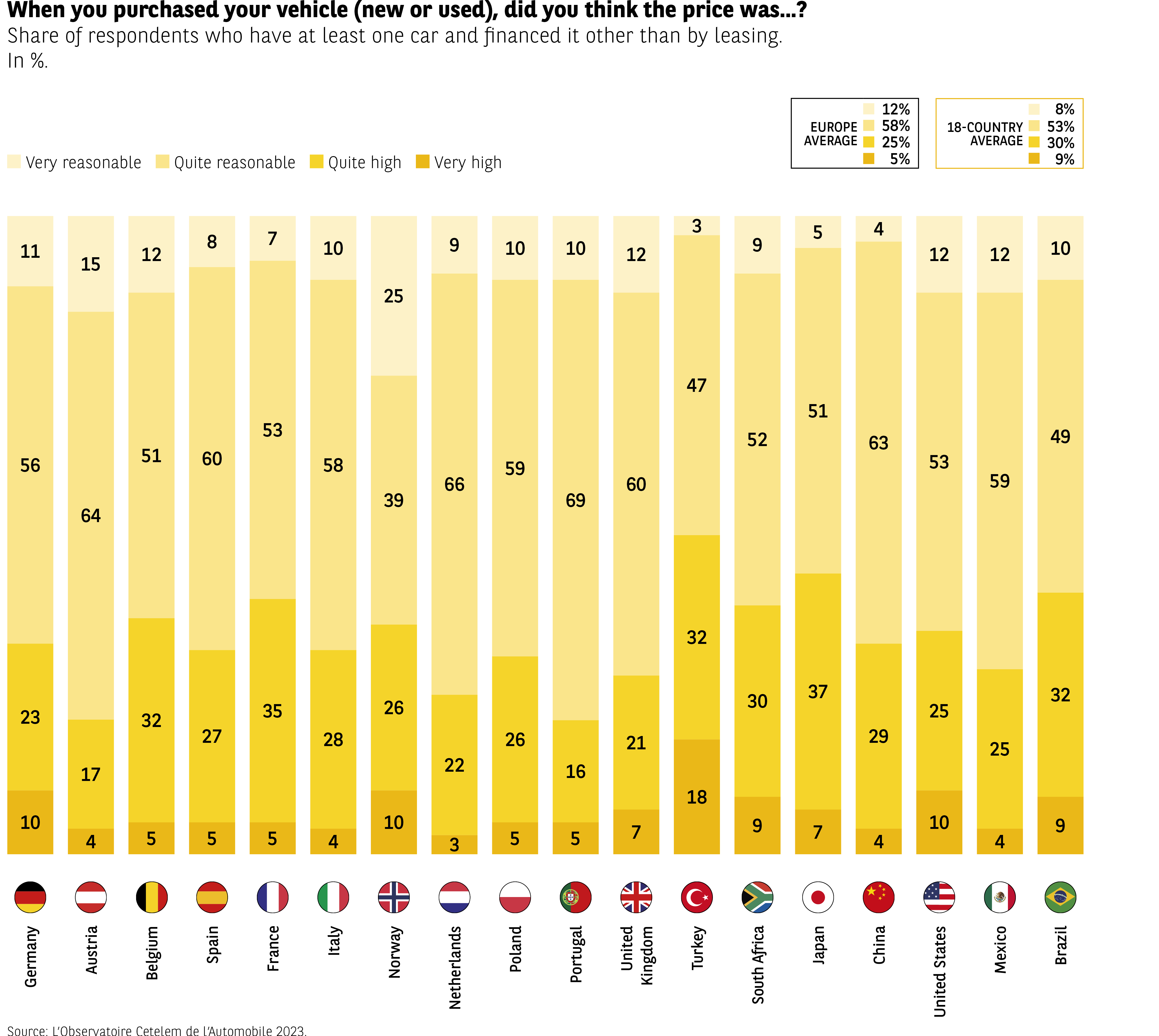 Compares how car buyers in 18 countries perceive vehicle prices, across four levels from reasonable to very high. The infographic shows how buyers perceived the price of their vehicle (new or used) at the time of purchase in 18 countries. It covers respondents who own at least one car and did not finance it through leasing. The readable values are (very reasonable, rather reasonable, rather high, and very high): Germany: 10 %, 23 %, 56 %, 11 % Austria: 4 %, 32 %, 64 %, 15 % Belgium: 5 %, 27 %, 51 %, 17 % Spain: 5 %, 32 %, 60 %, 12 % France: 5 %, 35 %, 53 %, 8 % Italy: 4 %, 28 %, 58 %, 10 % Norway: 3 %, 26 %, 39 %, 25 % Netherlands: 5 %, 22 %, 66 %, 7 % Poland: 5 %, 26 %, 59 %, 10 % Portugal: 7 %, 21 %, 60 %, 12 % United Kingdom: 5 %, 30 %, 69 %, 3 % Turkey: 4 %, 37 %, 52 %, 9 % South Africa: 4 %, 29 %, 63 %, 5 % Japan: 4 %, 25 %, 53 %, 12 % China: 10 %, 25 %, 59 %, 6 % United States: 4 %, 32 %, 49 %, 15 % Mexico: 9 %, 25 %, 59 %, 7 % Brazil: 9 %, 32 %, 49 %, 10 % A summary box displays averages: – Europe average: 12 %, 58 %, 25 %, 5 % – 18-country average: 8 %, 53 %, 30 %, 9 % Overall, the data shows substantial differences between countries: some see vehicle prices as mostly reasonable (Italy, Spain), while others perceive them predominantly as high (United Kingdom, South Africa). The very high category remains a minority in most countries. Source: Observatoire Cetelem de l’Automobile 2023.