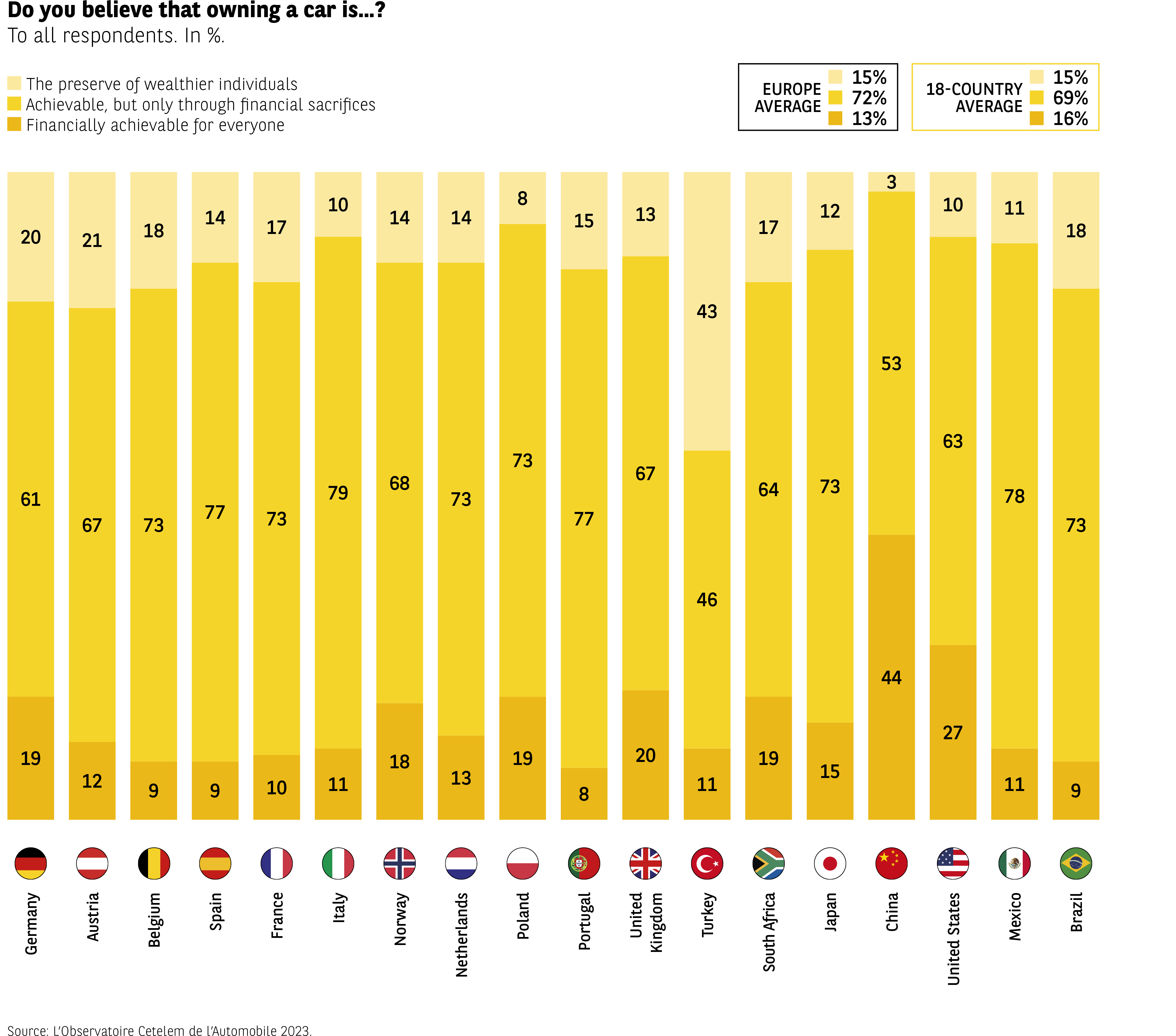 Shows how people in 18 countries perceive car ownership as affordable, requiring sacrifices, or reserved for wealthier households. The infographic shows how residents of 18 countries assess the financial accessibility of owning a car. Results are expressed in percentages and distributed across three categories: reserved for the wealthiest, affordable but requiring financial sacrifices, and financially accessible to all. The readable values for each country are (accessible to all, accessible with sacrifices, reserved): Germany: 19 %, 61 %, 20 % Austria: 12 %, 67 %, 21 % Belgium: 9 %, 73 %, 18 % Spain: 9 %, 77 %, 14 % France: 10 %, 73 %, 17 % Italy: 11 %, 79 %, 10 % Norway: 18 %, 68 %, 14 % Netherlands: 13 %, 73 %, 14 % Poland: 19 %, 77 %, 8 % Portugal: 20 %, 67 %, 13 % United Kingdom: 11 %, 64 %, 25 % Turkey: 19 %, 46 %, 35 % South Africa: 11 %, 73 %, 17 % Japan: 15 %, 44 %, 41 % China: 27 %, 63 %, 10 % United States: 11 %, 78 %, 10 % Mexico: 11 %, 73 %, 16 % Brazil: 9 %, 73 %, 18 % Two summary boxes show average values (accessible to all, accessible with sacrifices, reserved): – Europe average: 13%, 72%, 15% – 18-country average: 16%, 69%, 15% General patterns indicate strong differences between countries. In Western Europe (France, Spain, Italy), car ownership is mainly seen as accessible but requiring sacrifices. Turkey, Japan and China show higher proportions considering it reserved for wealthier households. Several countries (United States, Poland, Spain) show a large majority viewing it as accessible with financial effort. Source: Observatoire Cetelem de l’Automobile 2023.