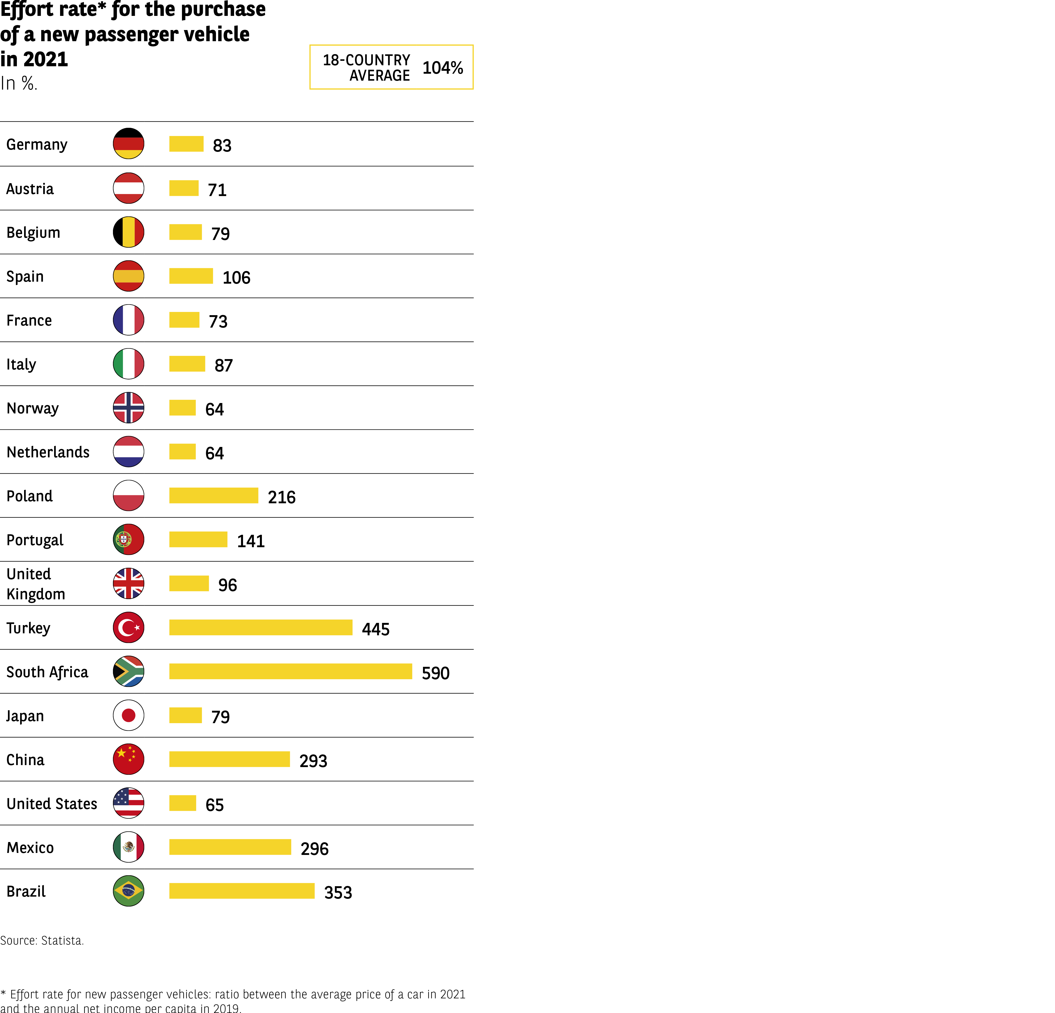 According to motorists, buying a car is achievable but requires sacrifices to be made. The indicator appropriately named the “effort rate” shows this in stark relief. Measured by calculating the ratio between the price of a car and the average annual income, this rate is close to or greater than 1 in some countries (Fig 9): buying a car costs some individuals their entire annual wage.