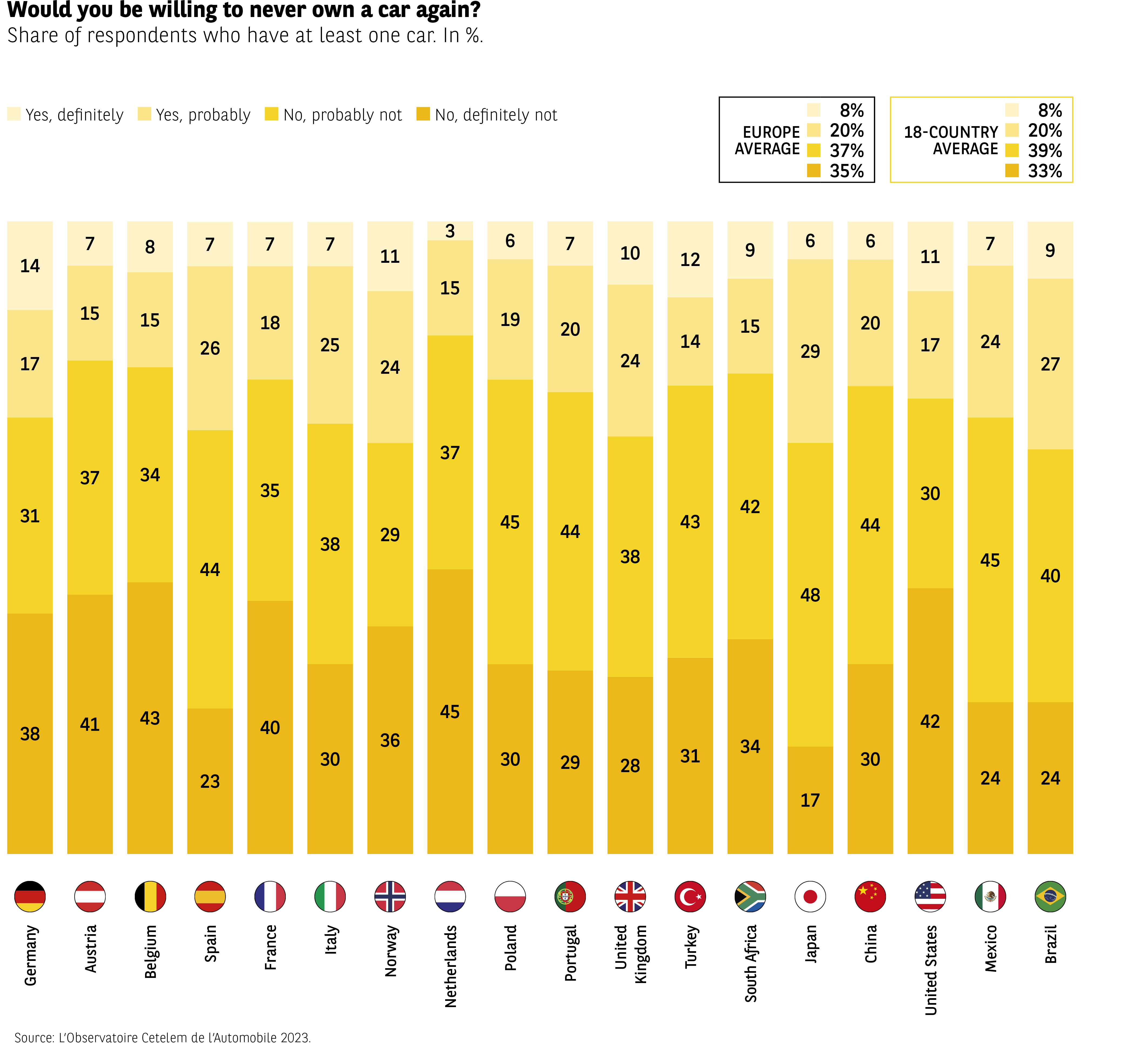 Shows the share of people willing or unwilling to give up owning a car in 18 countries. The infographic displays four categories of answers to the question: “Would you be willing to give up owning a car permanently?” The values are given for 18 countries. Two averages are shown: – Europe: 8% / 20% / 37% / 35% – 18 countries: 8% / 20% / 39% / 33% The categories are: – Yes, certain – Yes, probably – No, probably not – No, definitely not Data (order from top to bottom: yes certain / yes probable / no probable / no definitely): Germany: 14 / 17 / 31 / 38 Austria: 7 / 15 / 37 / 41 Belgium: 8 / 15 / 34 / 43 Spain: 7 / 26 / 35 / 23 France: 7 / 18 / 38 / 30 Italy: 7 / 25 / 29 / 36 Norway: 11 / 15 / 37 / 45 Netherlands: 3 / 19 / 45 / 30 Poland: 6 / 20 / 44 / 30 Portugal: 7 / 14 / 38 / 41 United Kingdom: 10 / 24 / 43 / 24 Turkey: 12 / 29 / 38 / 21 South Africa: 9 / 15 / 42 / 34 Japan: 6 / 20 / 48 / 17 China: 11 / 17 / 30 / 42 United States: 7 / 24 / 45 / 24 Mexico: 9 / 27 / 40 / 24 Brazil: 9 / 24 / 45 / 22 In most countries, more than 60% of respondents say “no” (probably + definitely). Japan and Portugal show the highest levels of “definitely not.” Source: Observatoire Cetelem 2023