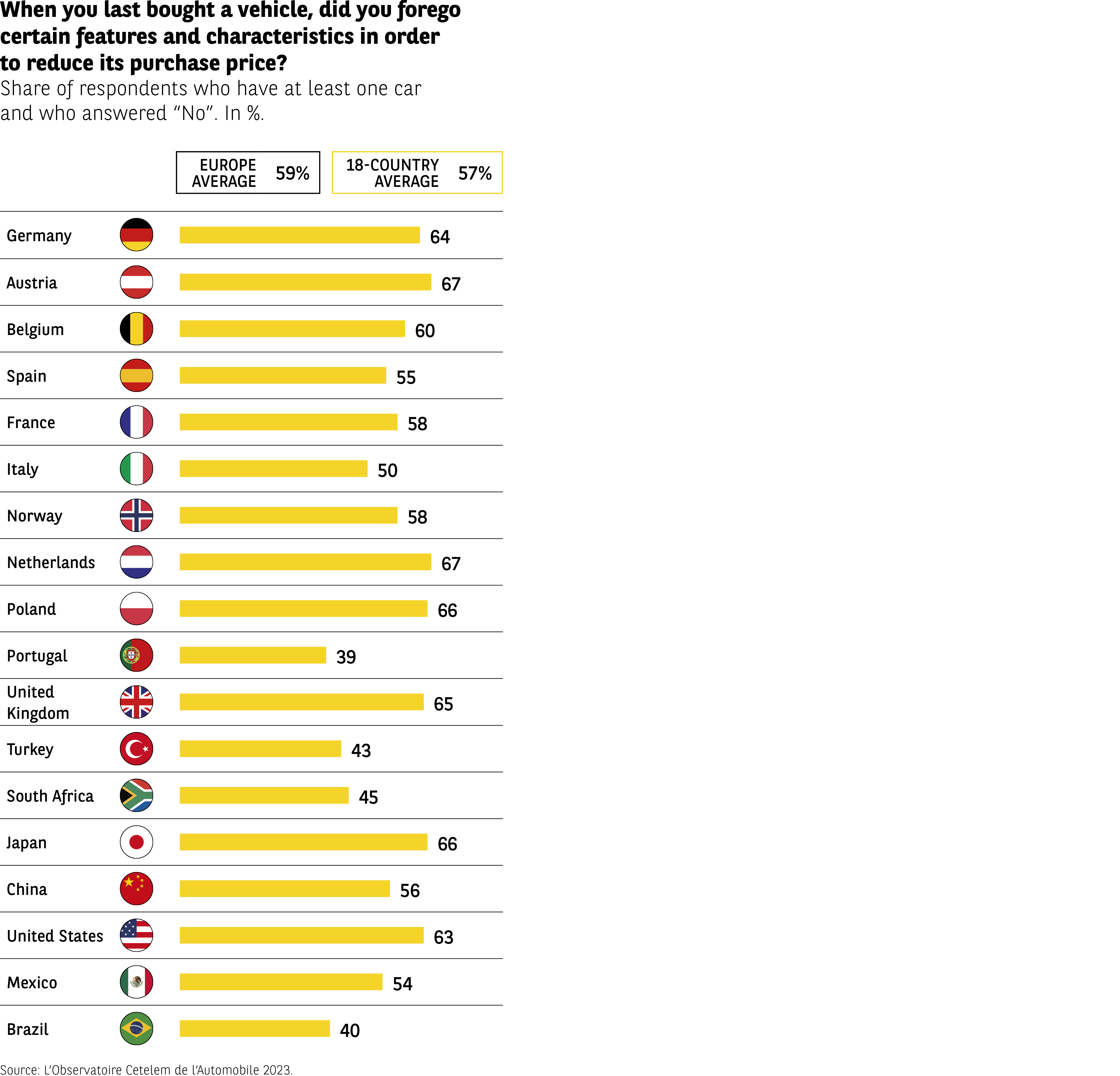Shows the share of people who gave up certain features to reduce the purchase price of a car in 18 countries. The infographic shows the proportion of people who bought a vehicle (new or used) and who did not give up certain features or equipment in order to reduce the price. Two reference values are shown: – Europe average: 59% – Average across 18 countries: 57% Country data (in %): Germany: 64 Austria: 67 Belgium: 60 Spain: 55 France: 58 Italy: 50 Norway: 58 Netherlands: 67 Poland: 66 Portugal: 39 United Kingdom: 65 Turkey: 43 South Africa: 45 Japan: 66 China: 56 United States: 63 Mexico: 54 Brazil: 40 The highest rates are found in Austria, the Netherlands, Poland, and Japan. The lowest values are found in Portugal, Brazil, and Turkey. Most countries are close to or slightly above the Europe and 18-country averages. Source: Observatoire Cetelem 2023