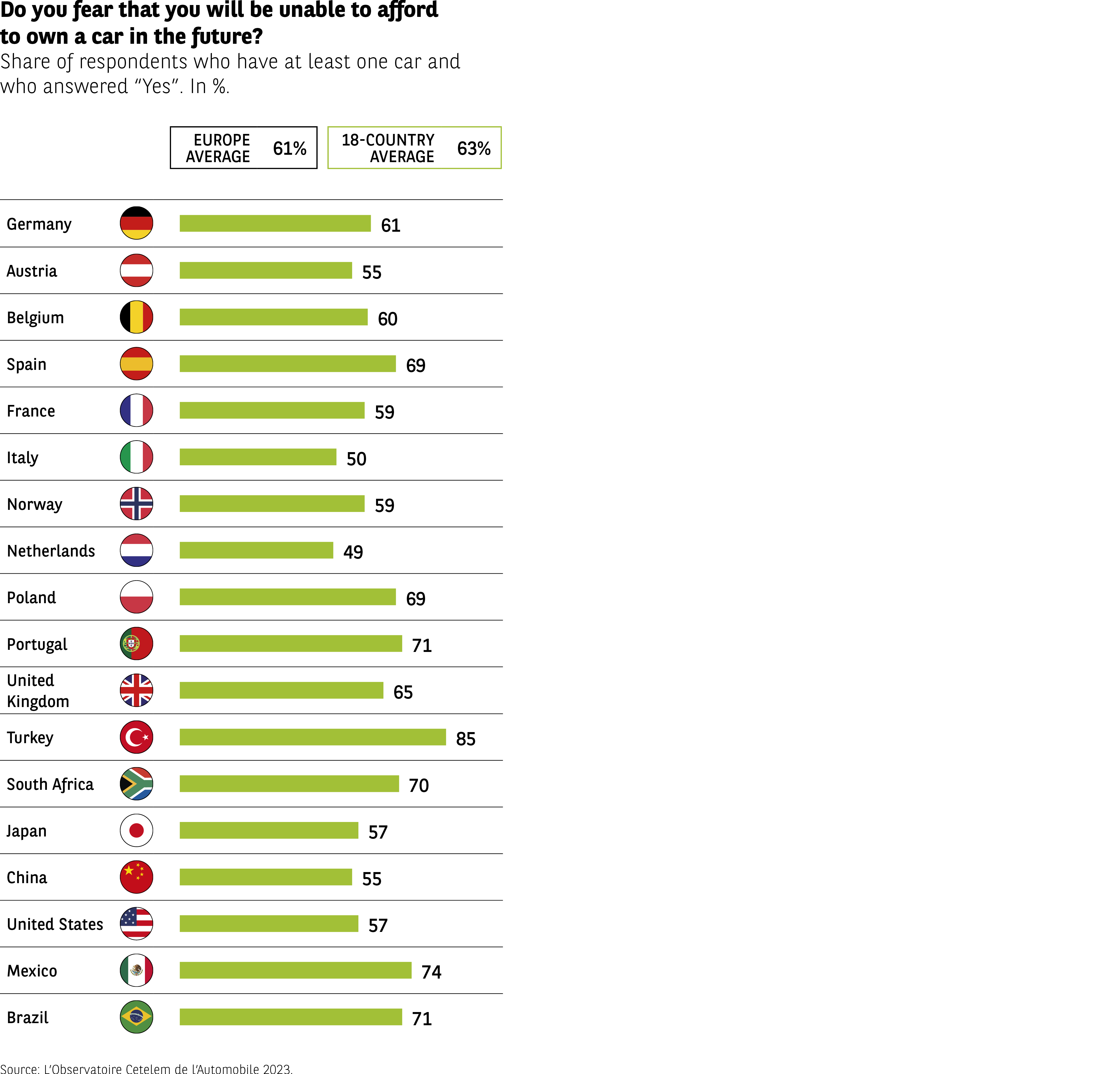 If cars are a source of financial pressure today, they are a cause for real concern about tomorrow, that’s if the testimonies gathered for this 2023 edition of L’Observatoire Cetelem are to be believed. 6 out of 10 respondents say they fear that they will no longer be able to afford to own a car in the future (Fig 47). We have seen how gloomy the Turks currently feel about day-to-day life, and they are equally dejected when they think about what awaits them. 85% share this fear of having to live without a car. The Mexicans, Portuguese, Brazilians and South Africans also feel pessimistic. The Netherlands is the only country where the majority are not of this view (49%). Italy and China post similar scores.
