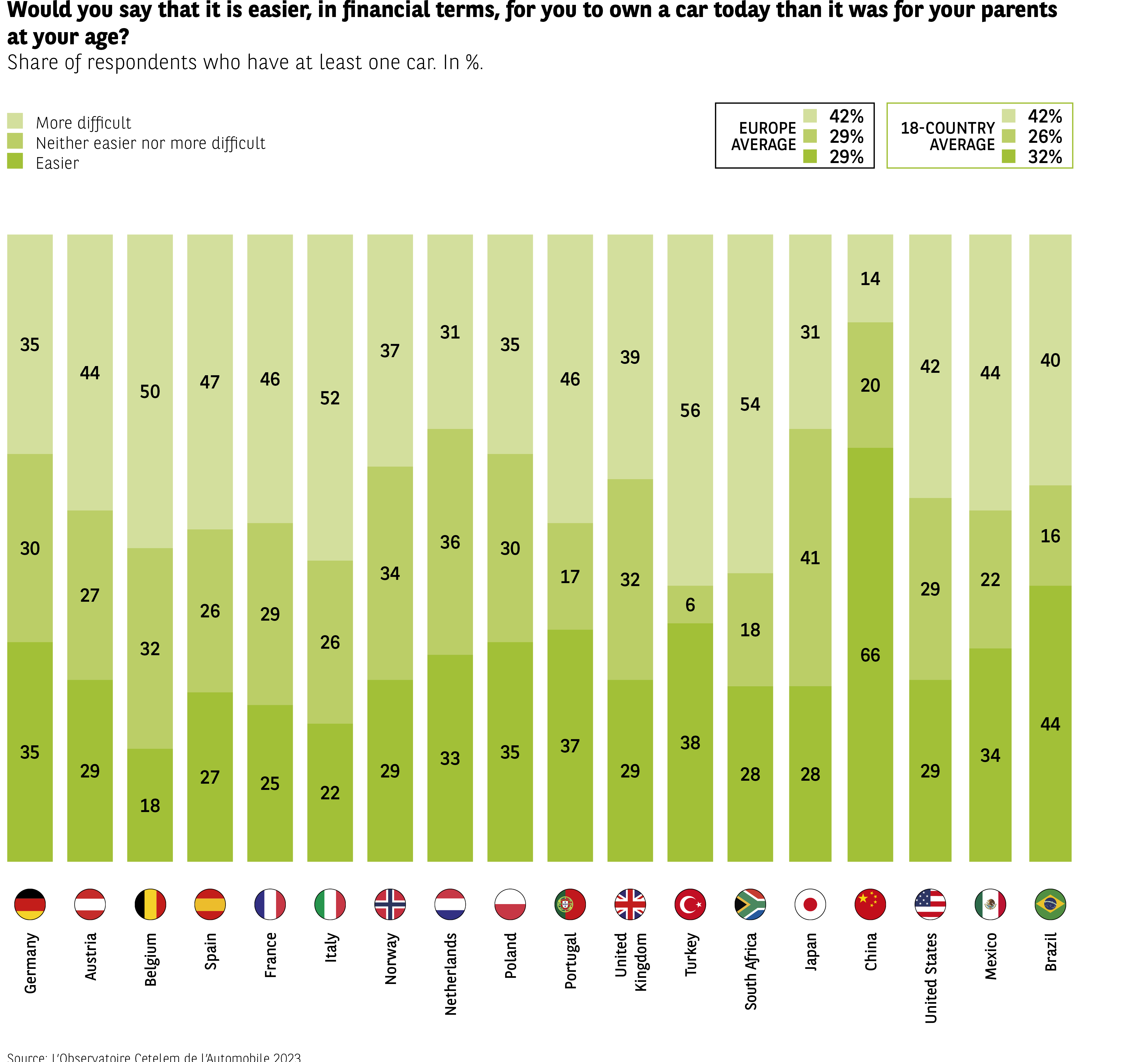 The infographic shows the share of respondents who say it is financially easier, the same, or harder for them to own a car compared with their parents at the same age.