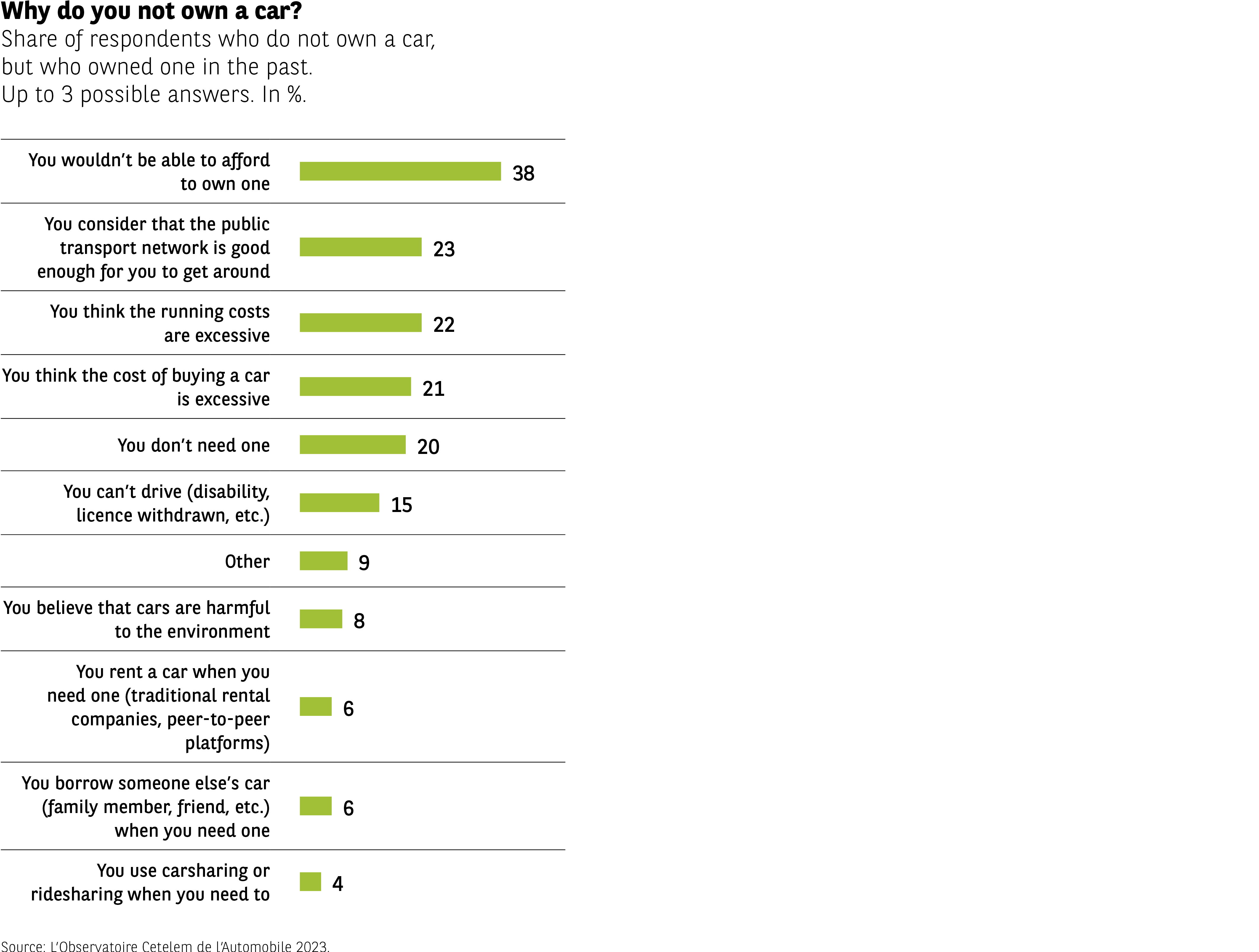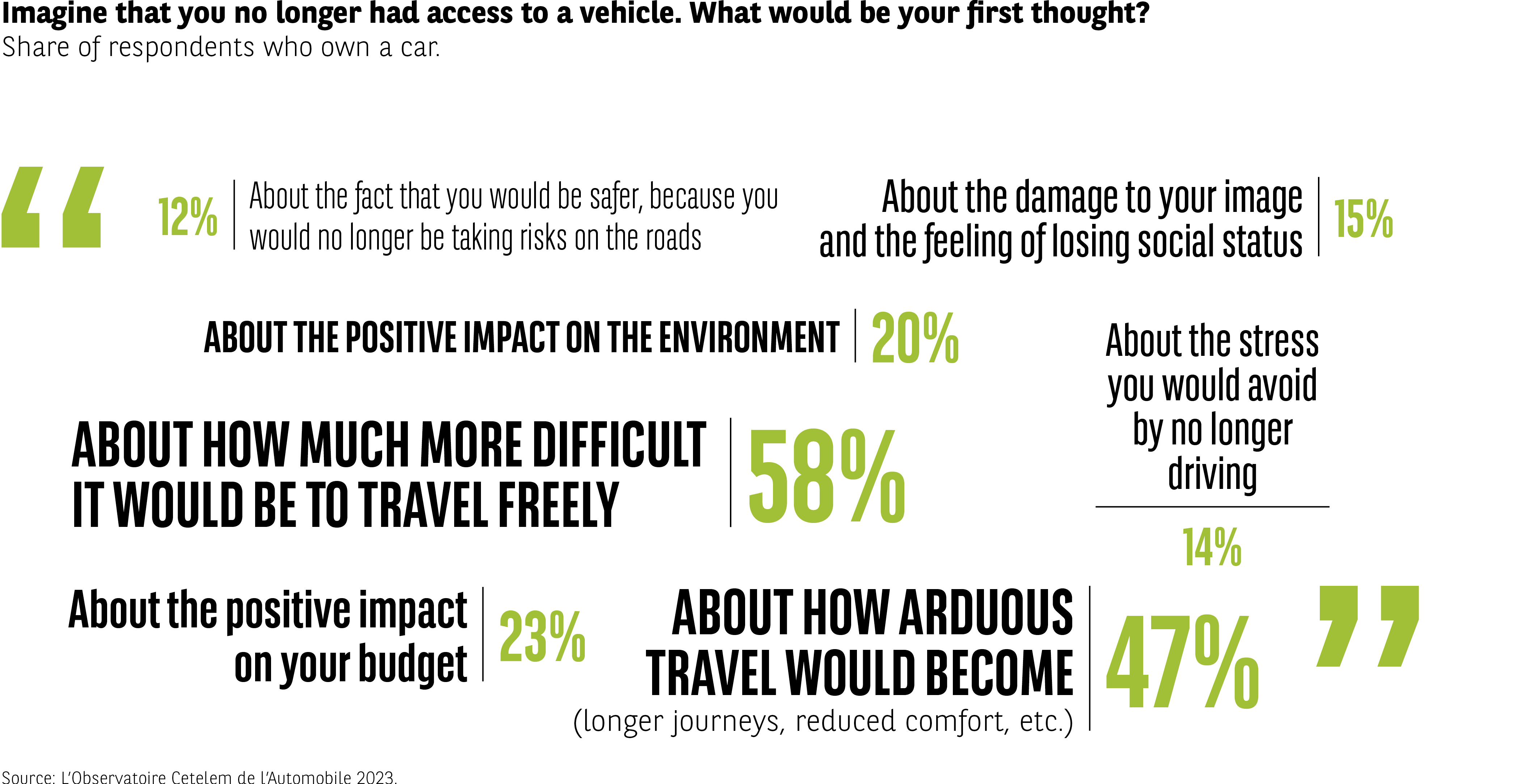 There is less agreement among respondents as we move down the list, but they do highlight certain more positive consequences. The first is the fact that their budget would be reduced, thanks to fewer expenses. Next comes the environmental impact of having fewer cars on the road, which would lead to lower emissions.