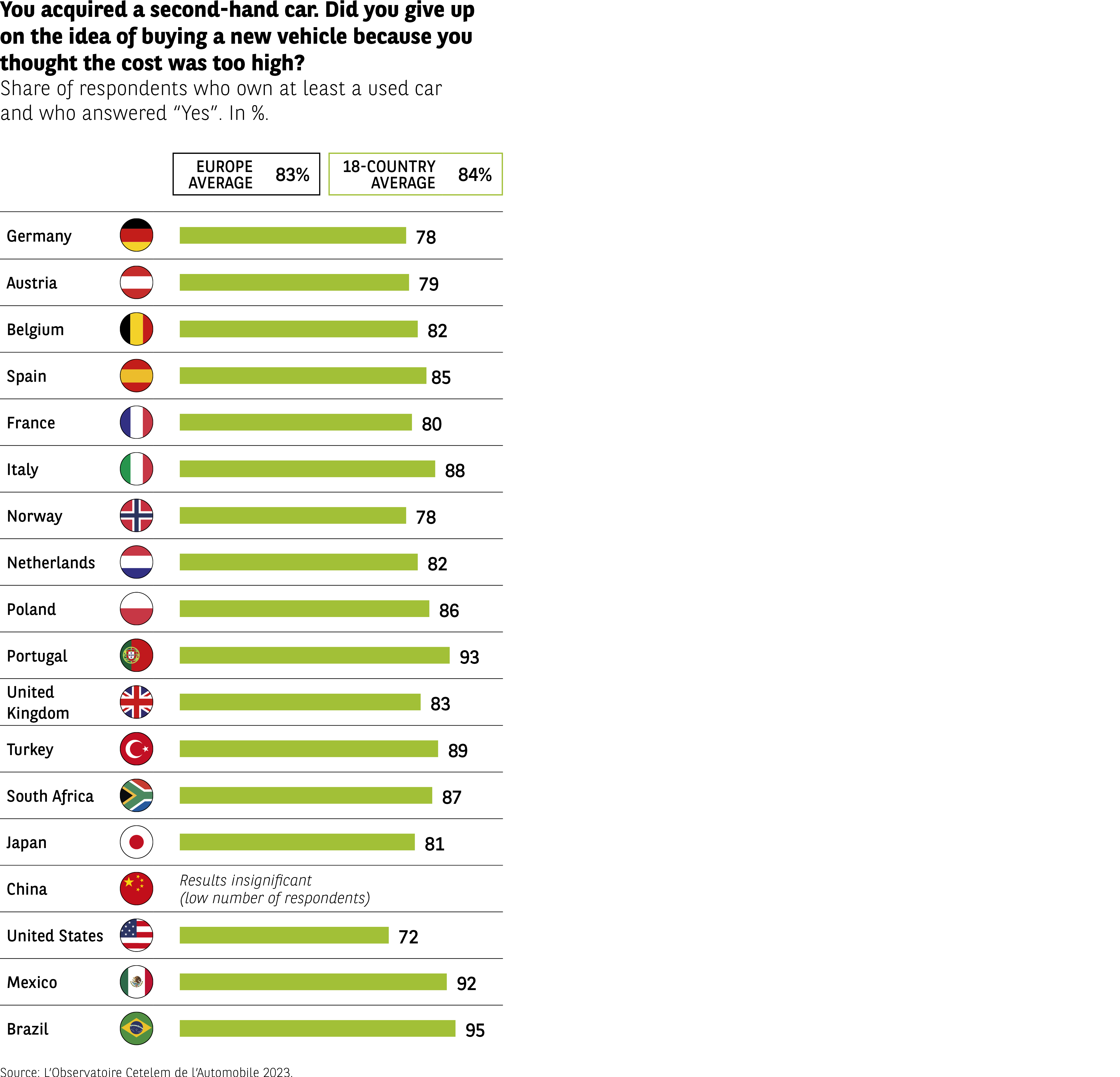 The infographic shows the percentage of respondents who purchased a used vehicle and report having renounced buying a new one because the price was too high.