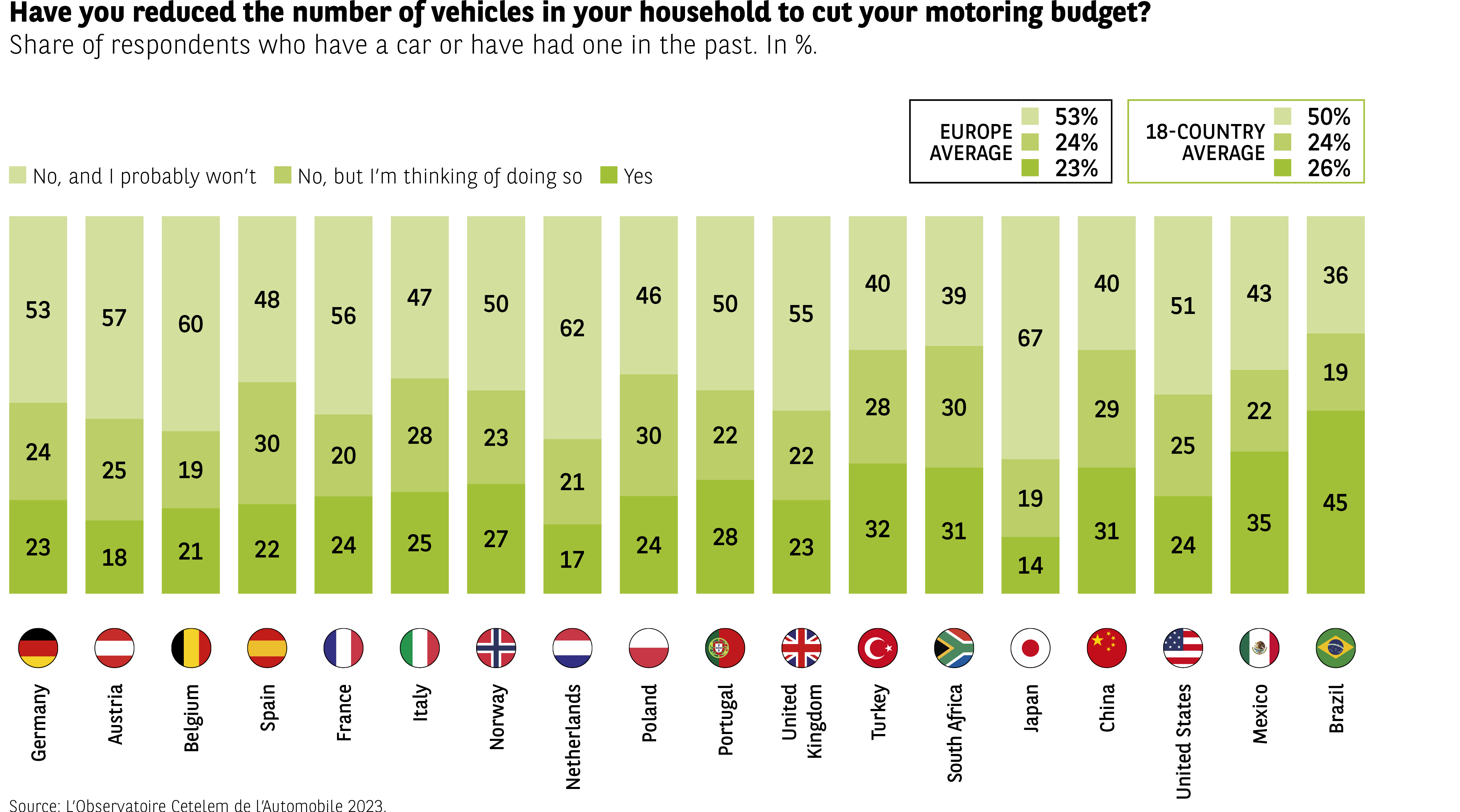 The infographic shows, for each country, the share of respondents who have already reduced the number of vehicles in their household, those who have not but may do so, and those who do not plan to do so.