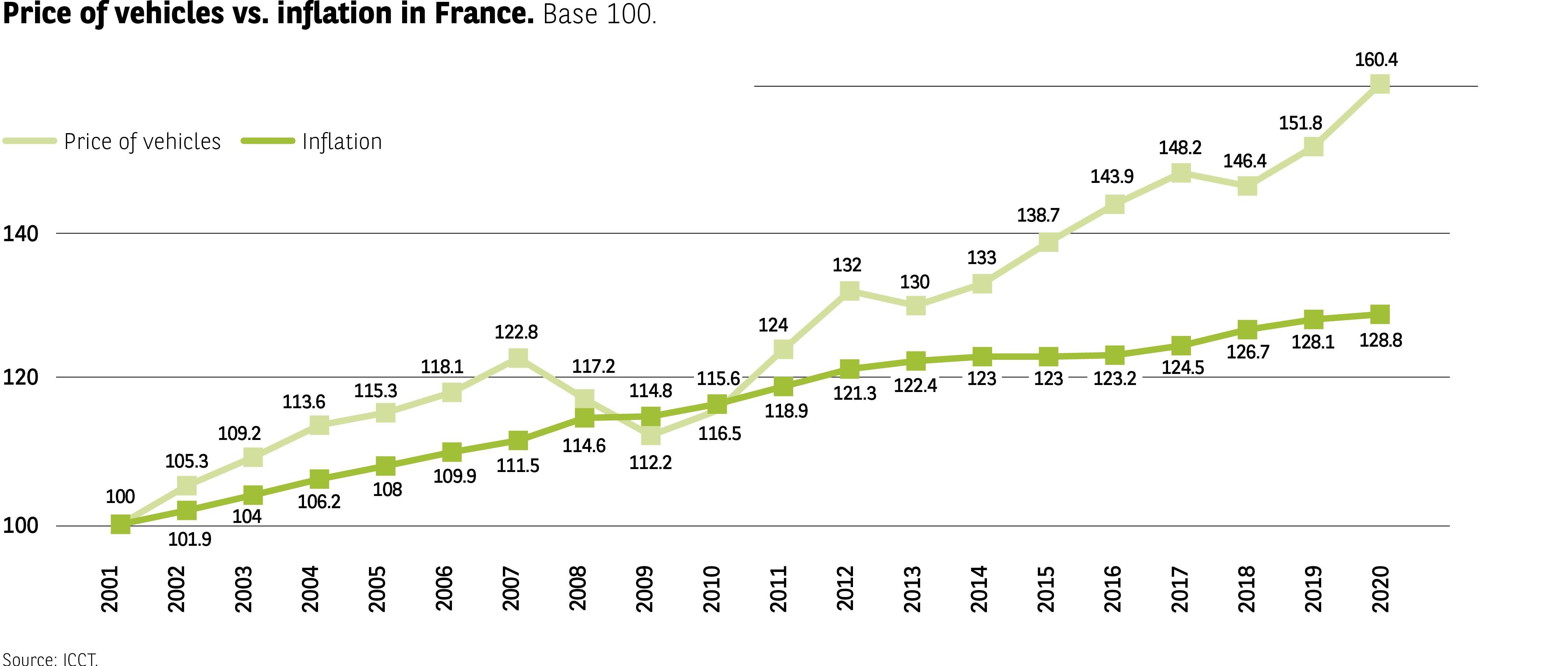 The infographic compares the evolution of vehicle prices with inflation in France from 2001 to 2020, with both starting at a base index of 100.