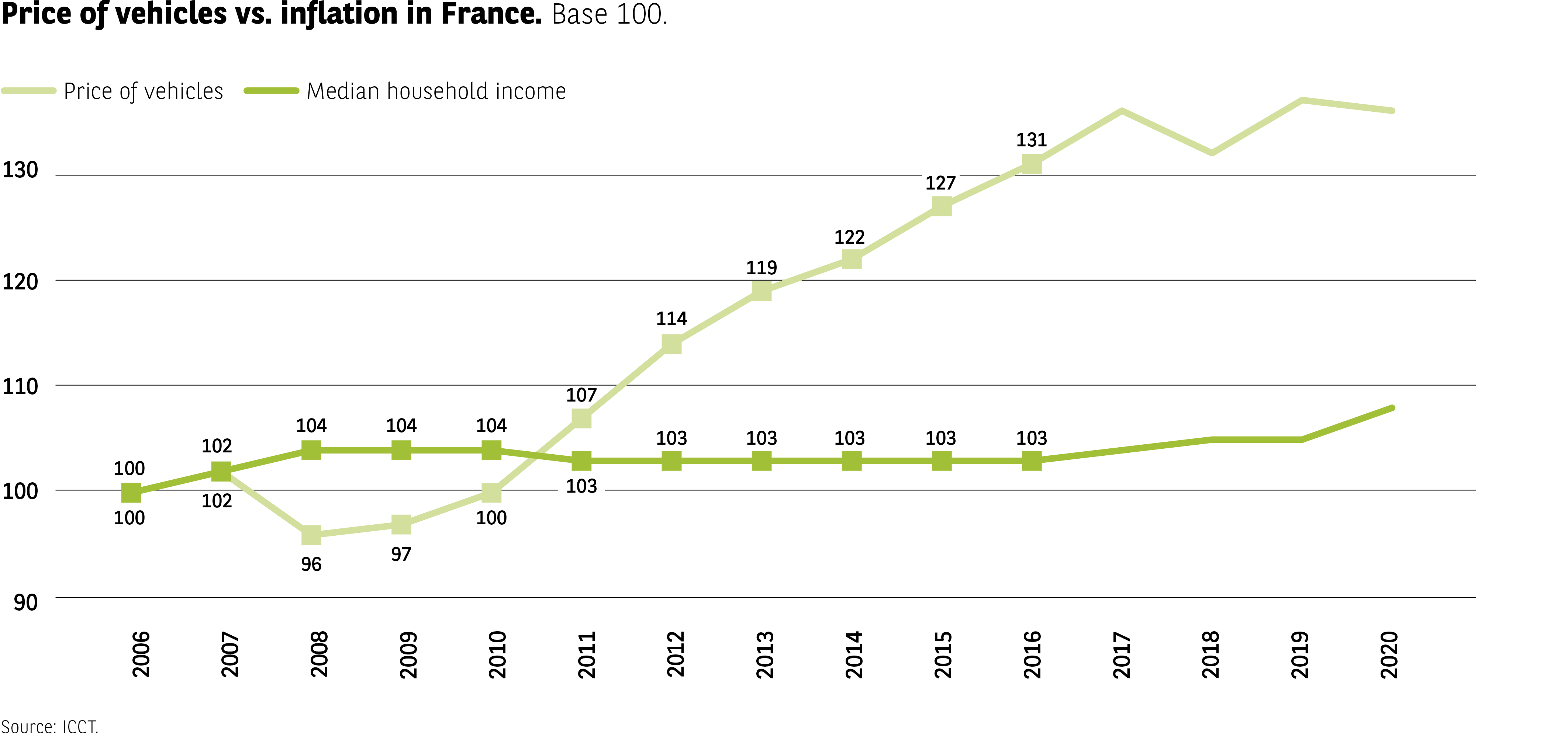 The infographic compares the evolution of vehicle prices with the evolution of median household income in France, from 2006 to 2020.