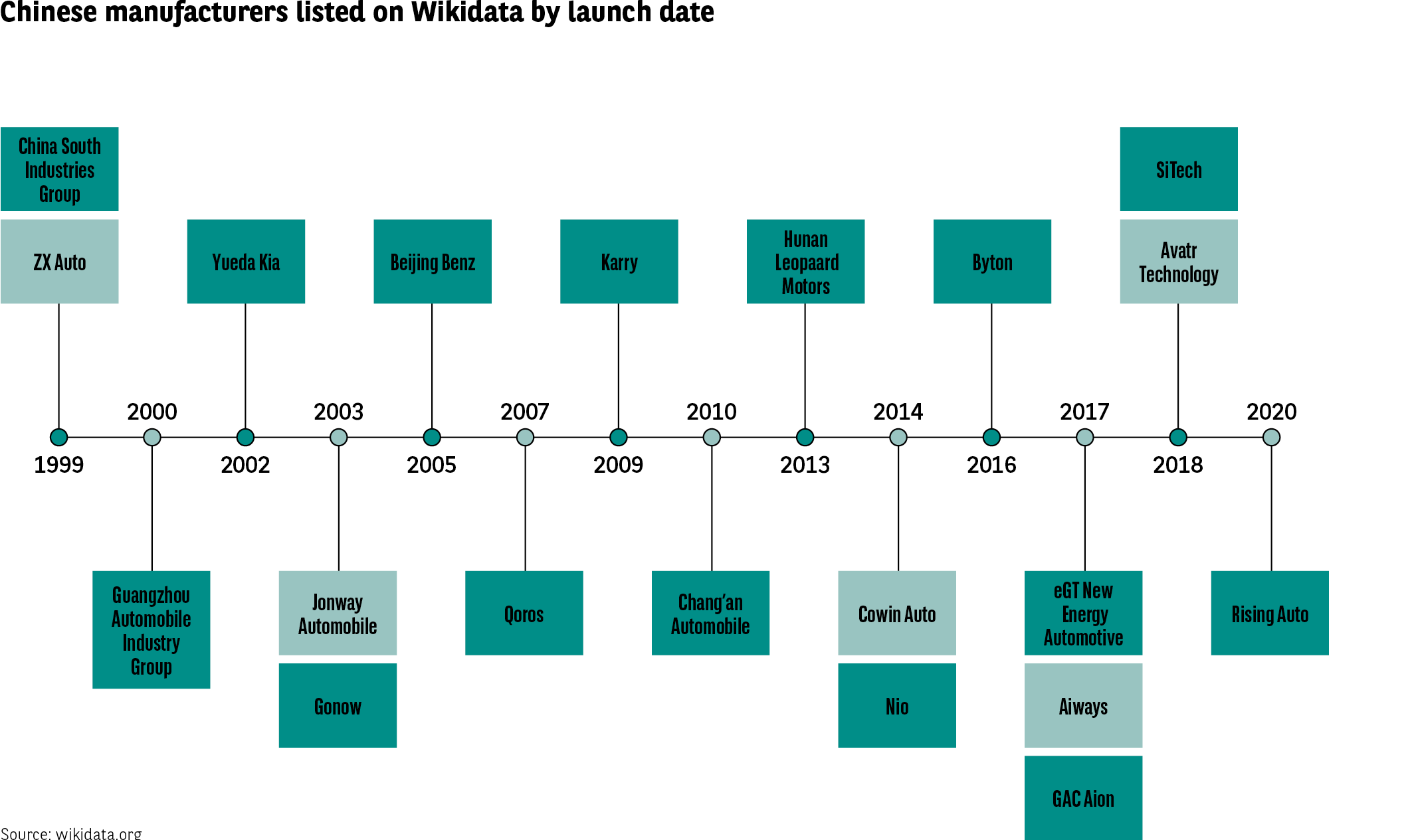 Each manufacturer is represented by a vertical block positioned at its year of creation.