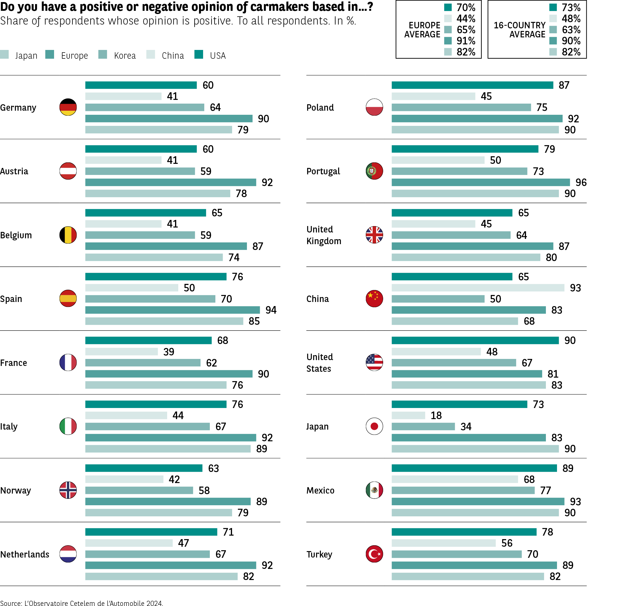 Not to be too outdone by this overwhelming score, Japanese brands come out very well, securing a positive opinion in 82% of cases. Naturally, it is in Japan that motorists are the most enthusiastic about the country’s brands, but they are just as popular in Mexico, Poland and Portugal. In China, geopolitical logic dictates that positive opinions barely reach 70%.