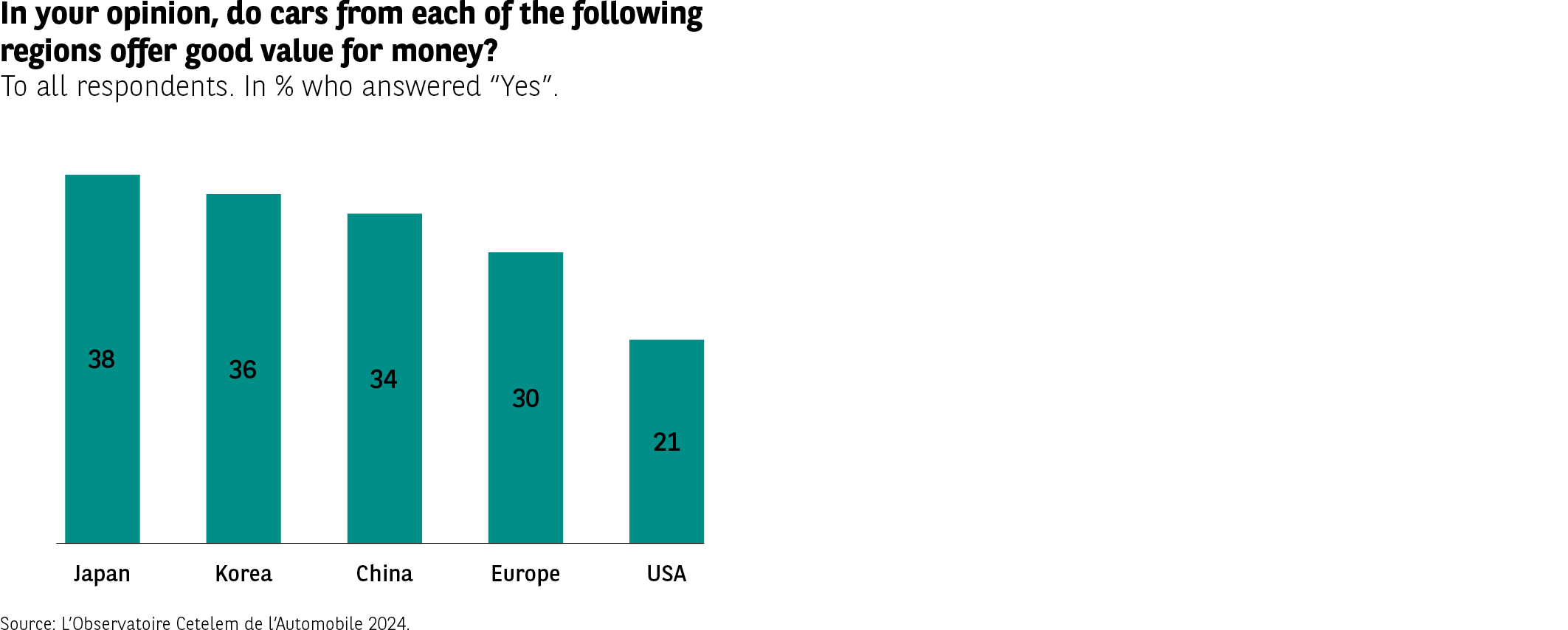 Meanwhile, European carmakers benefit from an impressive reputation, not least due to their longstanding presence in all markets. Indeed, their image is positive in the minds of 9 out of 10 respondents. On this point, the differences between the countries are naturally less pronounced, even if the Americans, Chinese and Japanese are somewhat more measured in their praise, given that their industries are in competition with these European players.