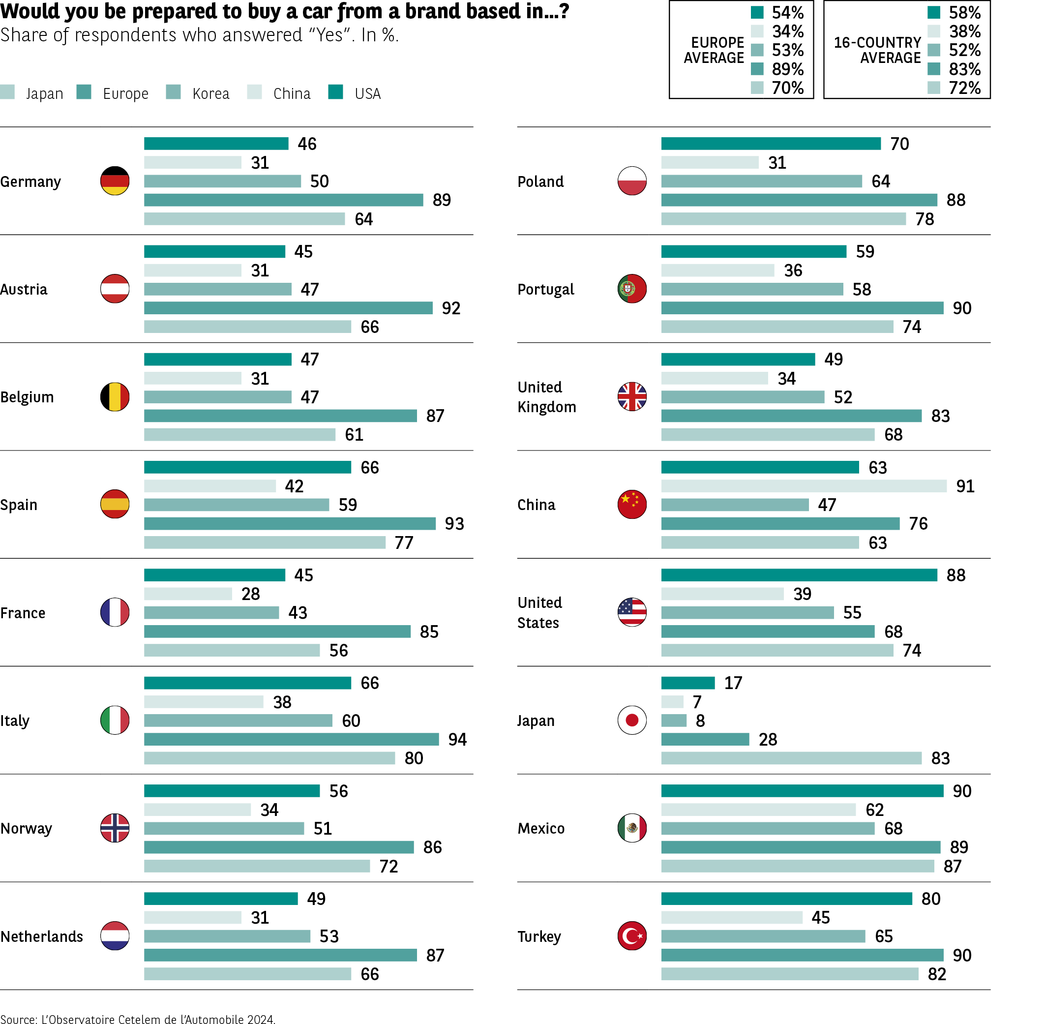 Now that we have established the respective reputations and qualities of the world’s brands, the main question is whether motorists are prepared to buy a vehicle. The responses gathered do not upset the established order, with the same brands securing people’s preferences in descending order. Just over 8 out of 10 respondents express a preference for buying European brands, while the Japanese remain firmly opposed to the idea (and generally to anything that isn’t “Made in Japan”).