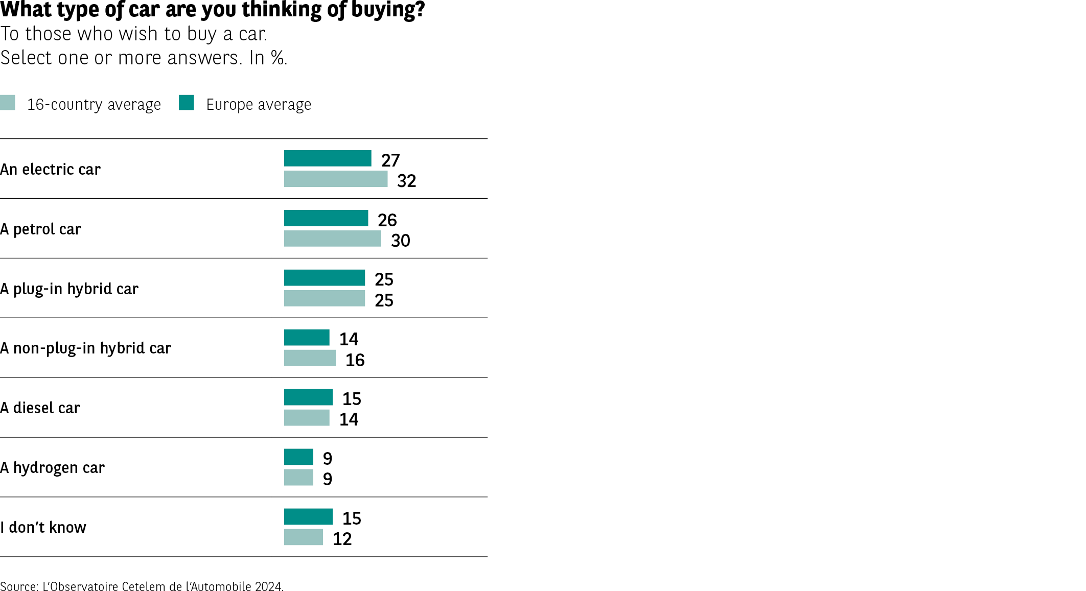 The Chinese and, to a lesser extent, the Norwegians consolidate their lead on matters electric, with purchasing intentions of 65% and 43% respectively. At the other end of the scale, France, Belgium, Austria and Poland are again the countries in which these intentions are the least pronounced, at around 20%.
