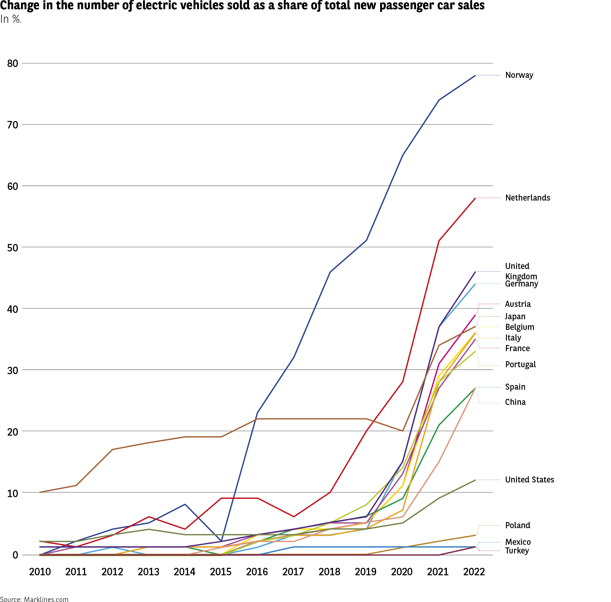 The growth of electric vehicles is very heterogeneous by country, with clear leaders (Norway, Netherlands) and accelerated global progression from 2016.