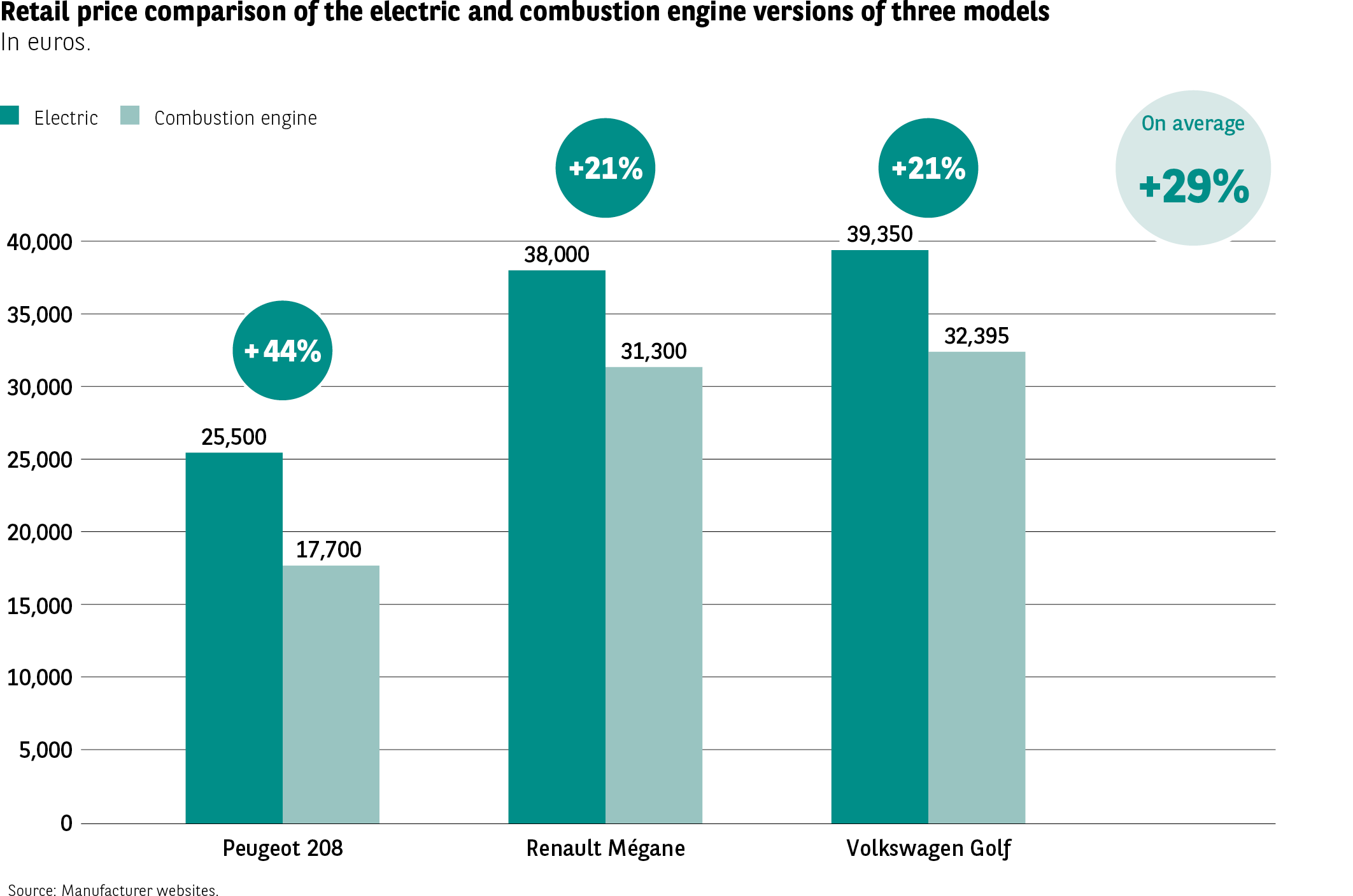 Vertical graph comparing the purchase prices of three cars in electric and thermal versions.
