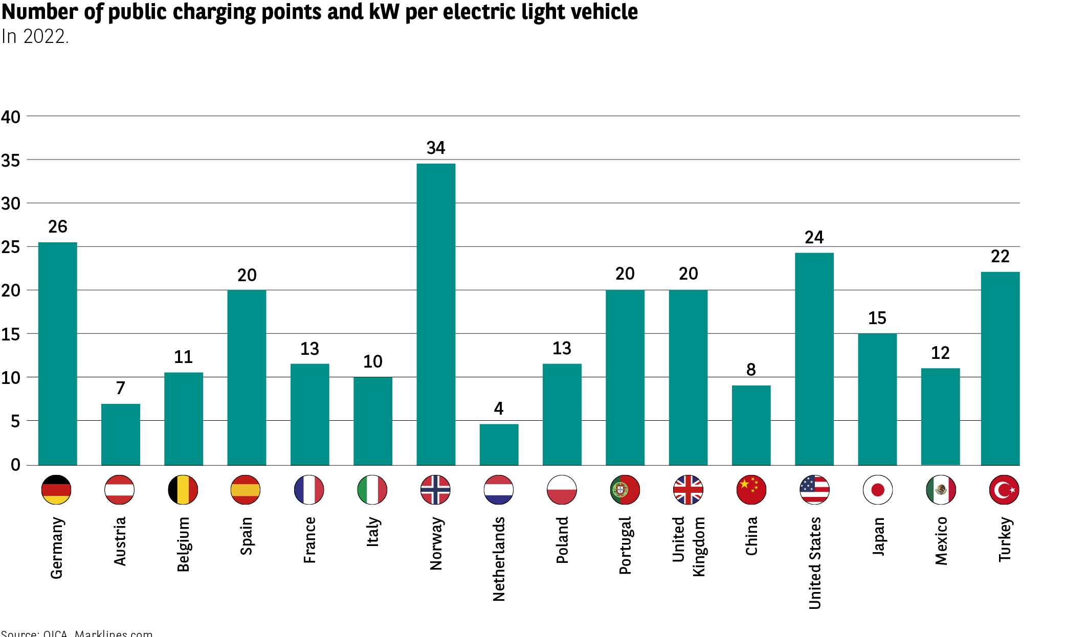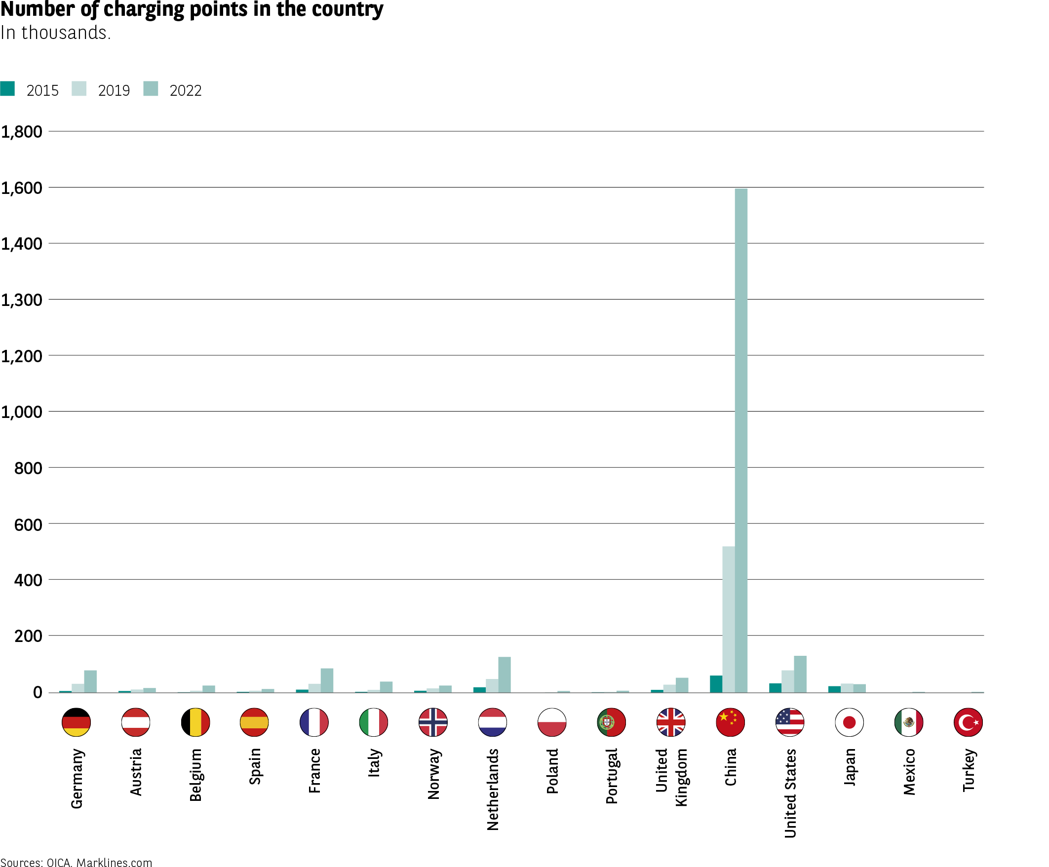 Vertical graph comparing the total number of charging points installed in 16 countries.