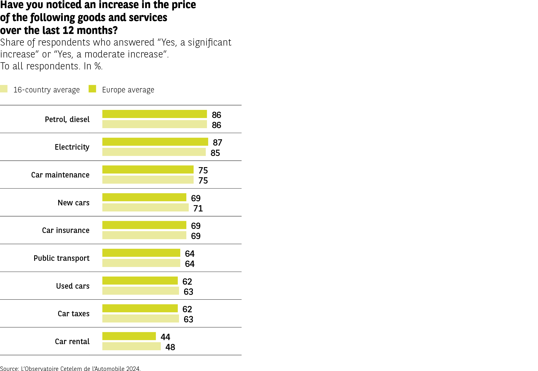 Bar chart showing, for several automotive-related items, the proportion of respondents who have noticed a price increase over the past 12 months. Horizontal graph presenting the responses to the question “Have you noticed a price increase for the following goods and services over the past 12 months?” The green bars correspond to the averages of 16 observed countries. The evaluated items (and their percentage of people declaring an increase) are: Gasoline and diesel: 86% Electricity: 85% Car maintenance: 75% New cars: 71% Car insurance: 69% Public transportation: 64% Used cars: 63% Taxes related to automobiles: 62% Car rental: 44% The graph reveals that all items are perceived as increasing, and very strongly for fuels and electricity. Source: Cetelem Automobile Observatory 2024.