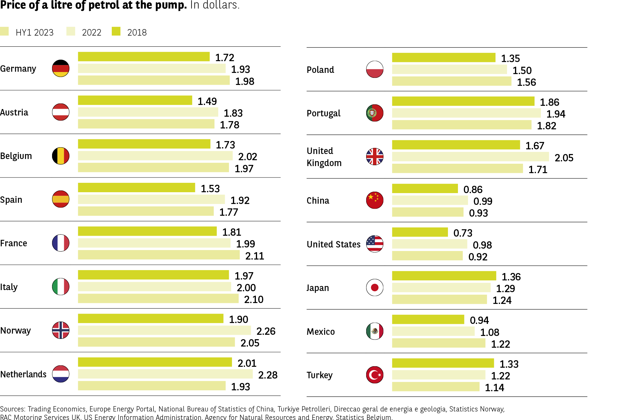 Bar chart comparing the prices of a liter of fuel in 2023 and 2018 in 16 countries. Horizontal graph covering 16 countries, presenting two values for each: price per liter in 2023 and 2018 (in dollars). Some examples: Germany: $1.72 (2023) vs $1.49 (2018) Belgium: $1.93 vs $1.70 Spain: $1.69 vs $1.39 France: $1.85 vs $1.53 Italy: $1.98 vs $1.71 China: $1.05 vs $0.79 United States: $1.03 vs $0.74 Turkey: $1.29 vs $0.92 A generalized increase in fuel prices is observed between 2018 and 2023 in all considered countries.