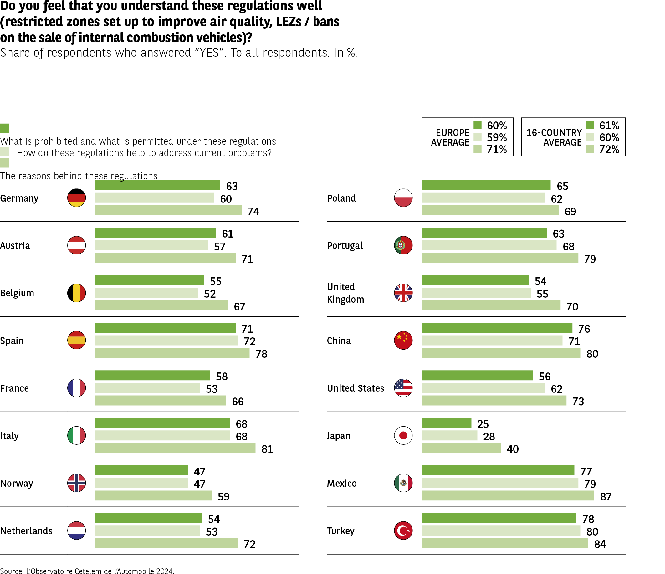 Faced with this regulatory jungle, the clear- sightedness of motorists can only be applauded. 6 out of 10 respondents consider them to be a decent solution to current problems. The Turks, Mexicans and Chinese are once again the most likely to display this level of understanding, along with the Spanish, Portuguese and Italians (around 80%). Conversely, the Japanese sharply disagree on this point (72% do not understand). In fact, Japan is the only country, along with Norway, where negative views outweigh positive opinion. In France, the “yes” camp achieves a slim majority.