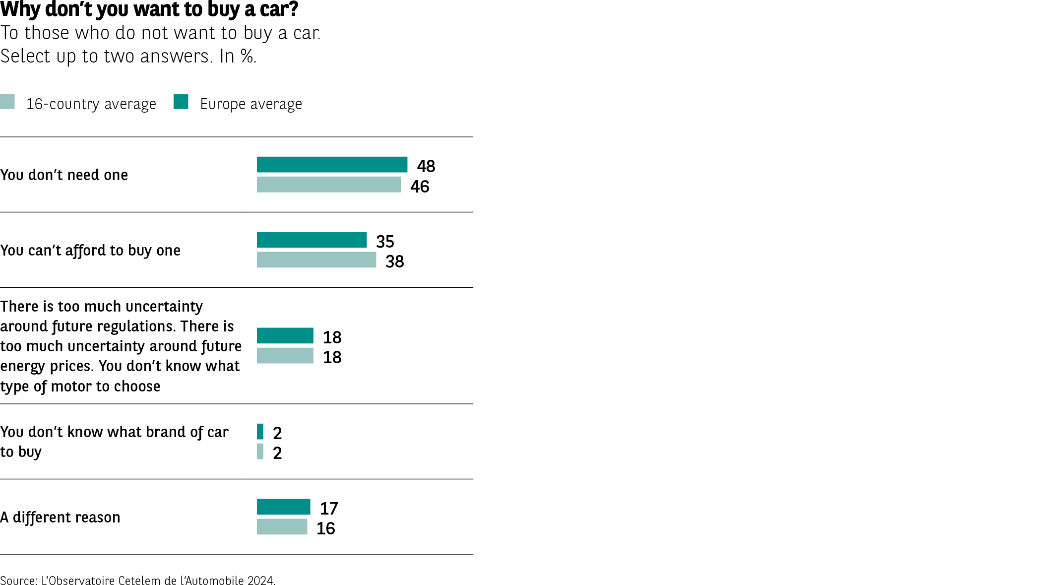 Almost half of those who do not want to buy a new car, be it today or in the future, put one main reason forward: they simply do not need one. This is particularly true in the UK and Austria. In Turkey, only 22% state that they can do without a car.