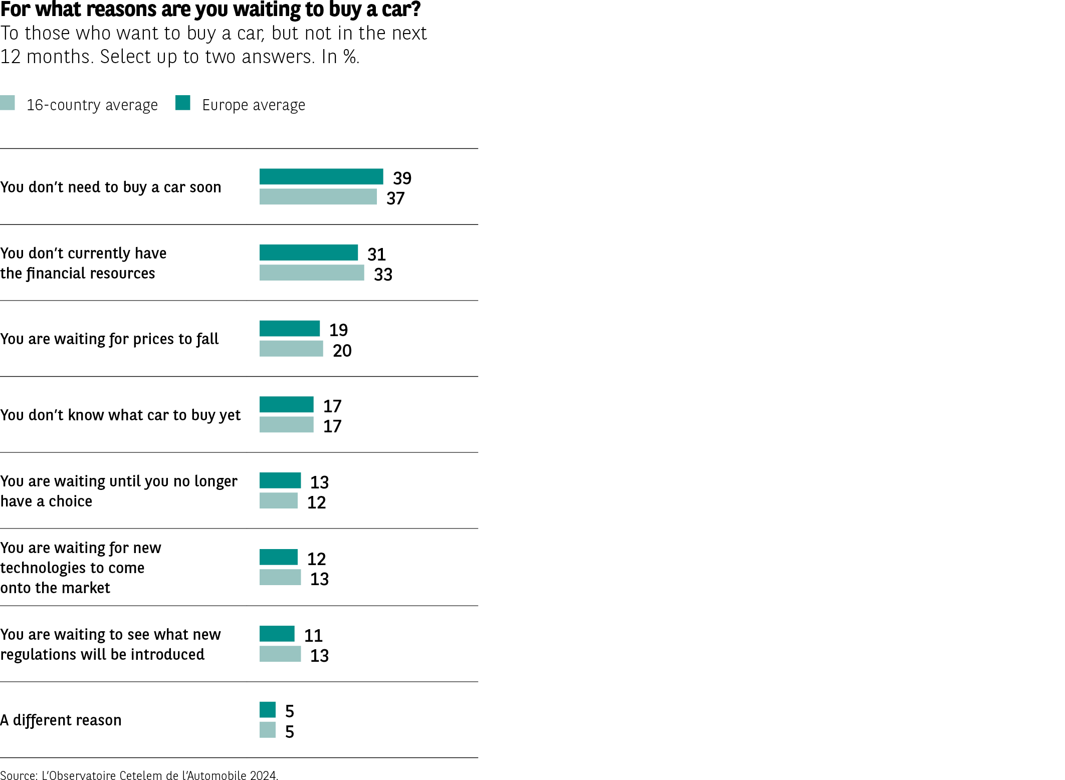 Those who are playing a waiting game give similar reasons for not making a purchase in the near future. Once again, the fact that they have no particular need for a car is the main reason put forward by nearly 4 out of 10 people, a view shared by a majority of respondents in Japan (58%). A current lack of financial resources to buy a car is cited by almost a third of motorists. True to form, the Turks and Mexicans also highlight these financial difficulties, followed closely by the Portuguese, but also the Norwegians, two populations that mention this factor in almost identical proportions. Despite leading the world in the adoption of electric vehicles, along with the Chinese, the Norwegians also seem fearful of the high cost of these cars compared with other types of powertrain (Fig. 43).