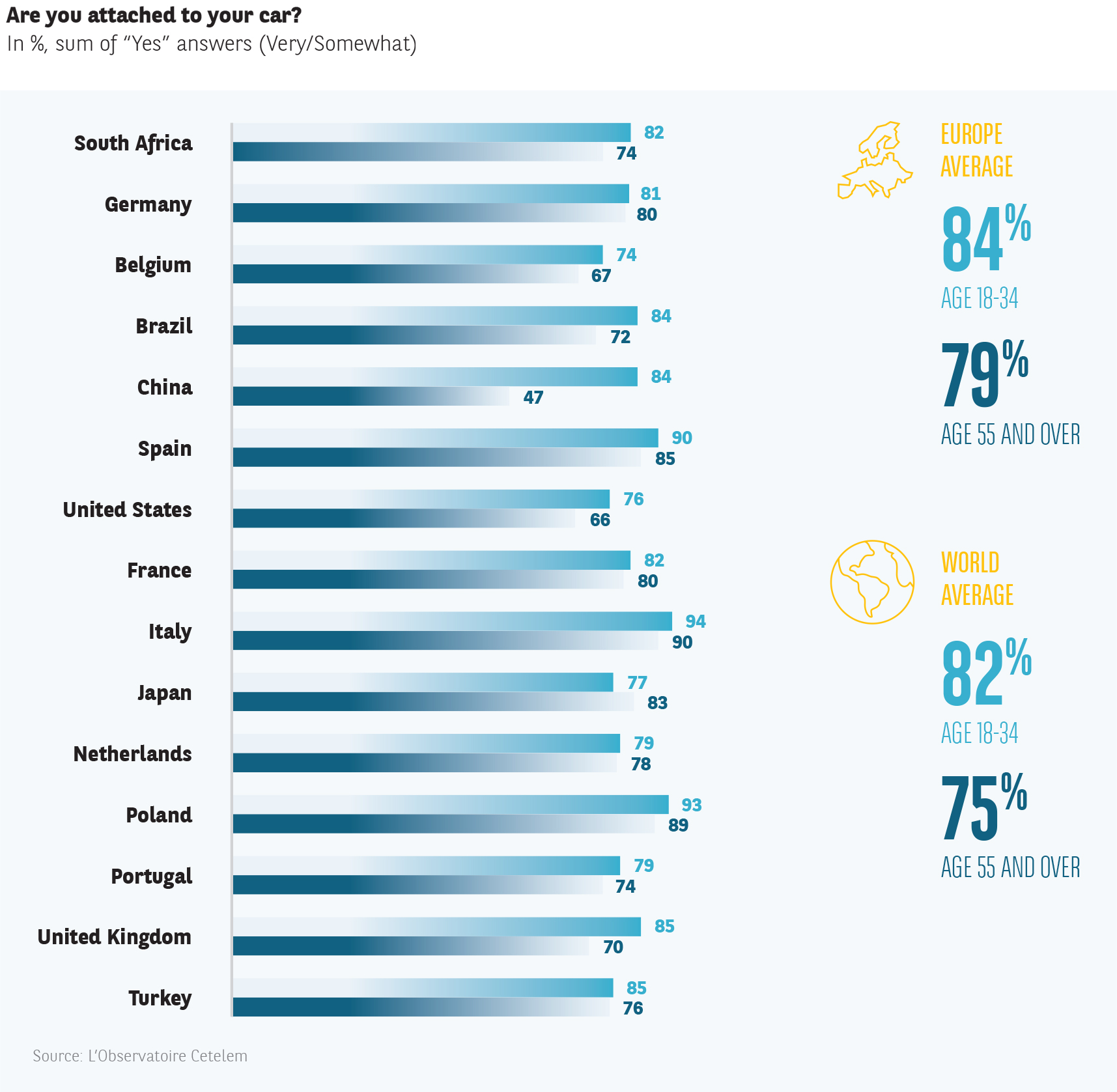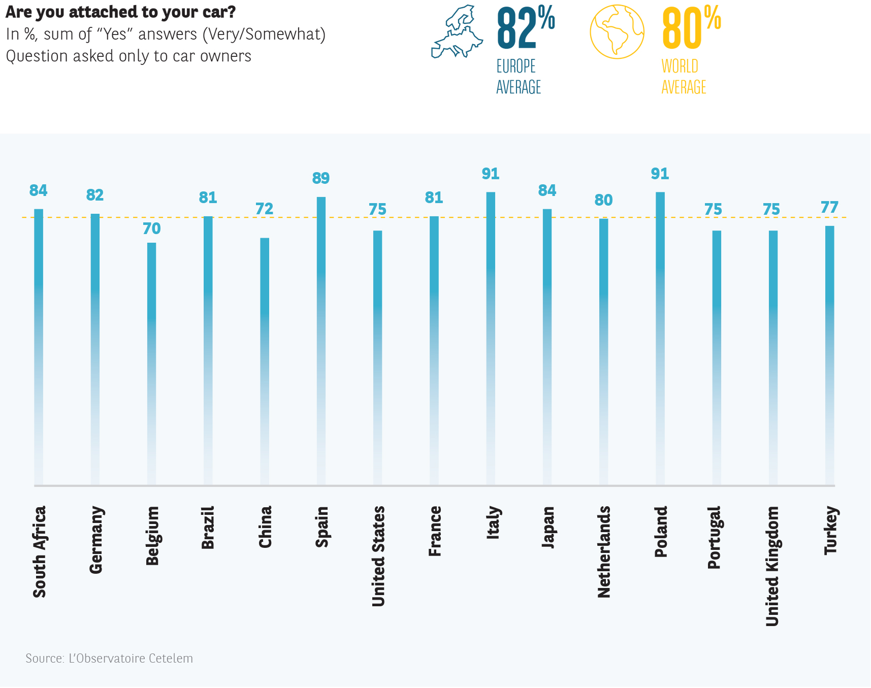 8 out of 10 people say they are attached to the vehicle they own (Fig.1). Italy, Poland and Spain are the most enthusiastic (9/10), while Belgium and China are less unanimous (7/10). France posts a result that is close to the average, while the United States, where the car is king, displays a little less fervour.