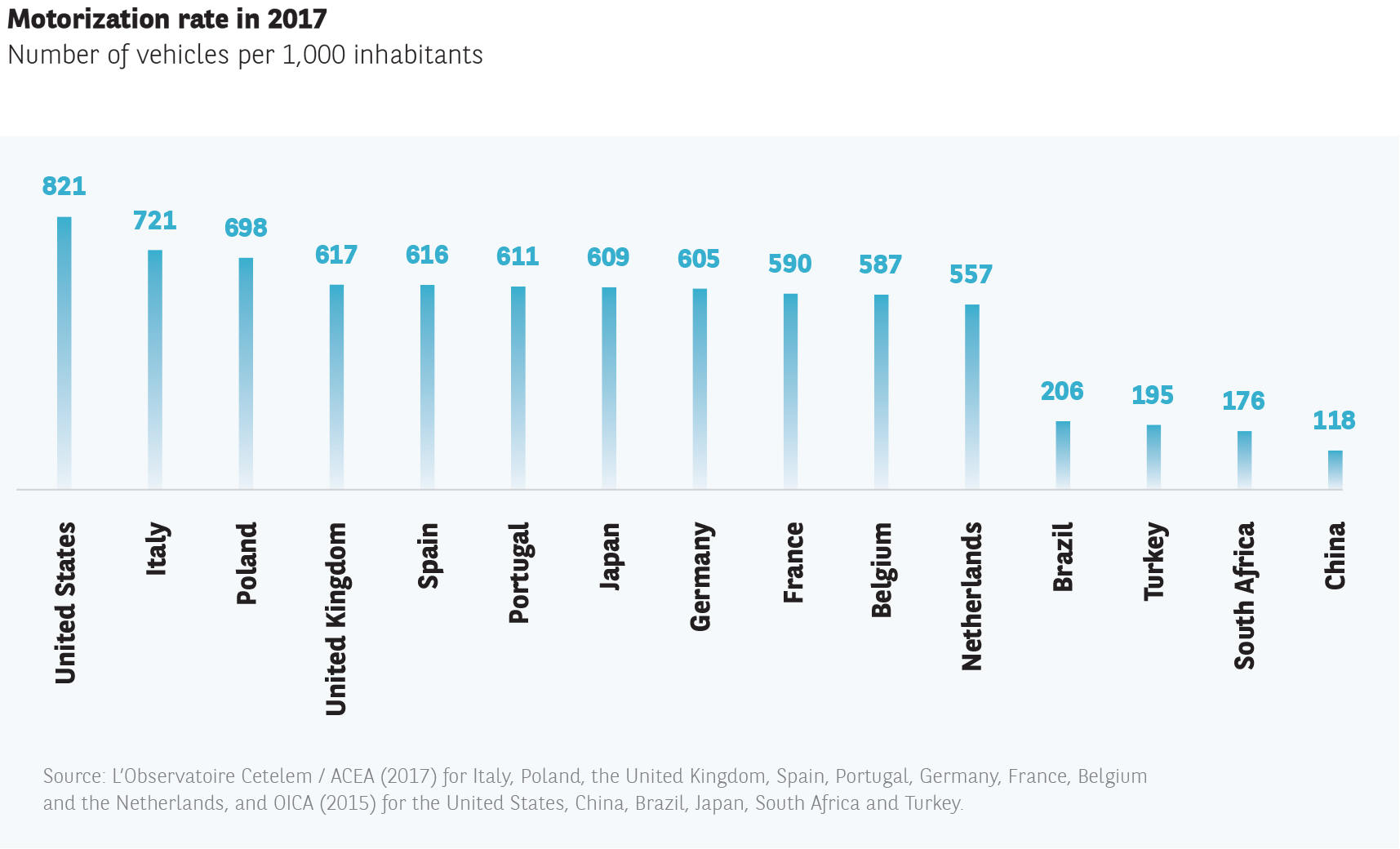 If proof of the popularity of cars were needed, motorization rates (Fig. 2 and 3) would be among the clearest pieces of evidence. In recent years, these figures have grown continuously in the countries of L’Observatoire Cetelem, with two notable caveats. Large urban centres in the Western world have experienced a decline.