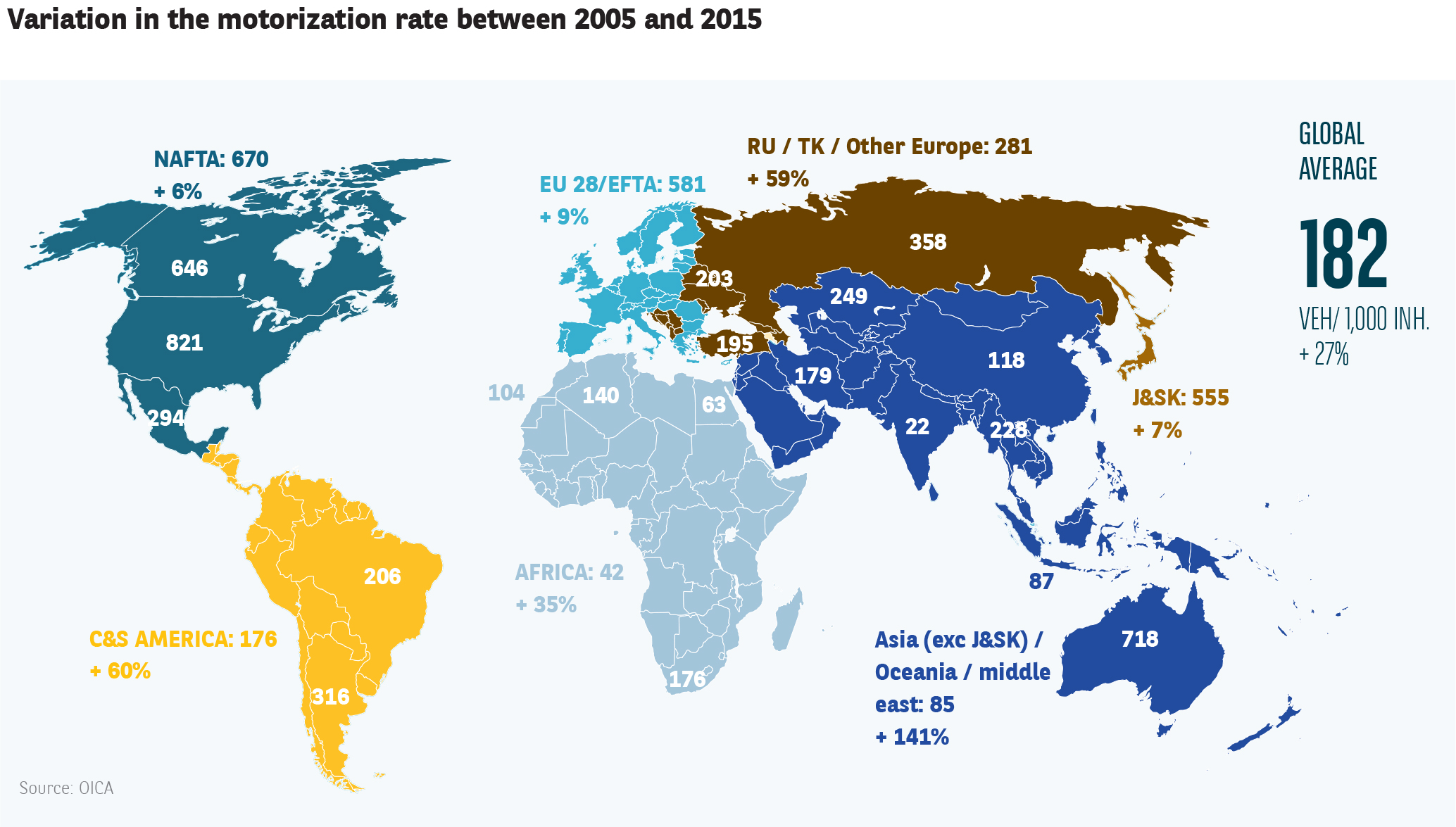 China, where sales are currently falling, continues to see an increase in its motorization rate. However, it still posts the lowest score in this ranking, closely followed by South Africa, Turkey and Brazil. These nations, where motorization rates are lower and have started to take off only recently, form a quartet whose behaviour is homogeneous and contrasts with that of other countries.