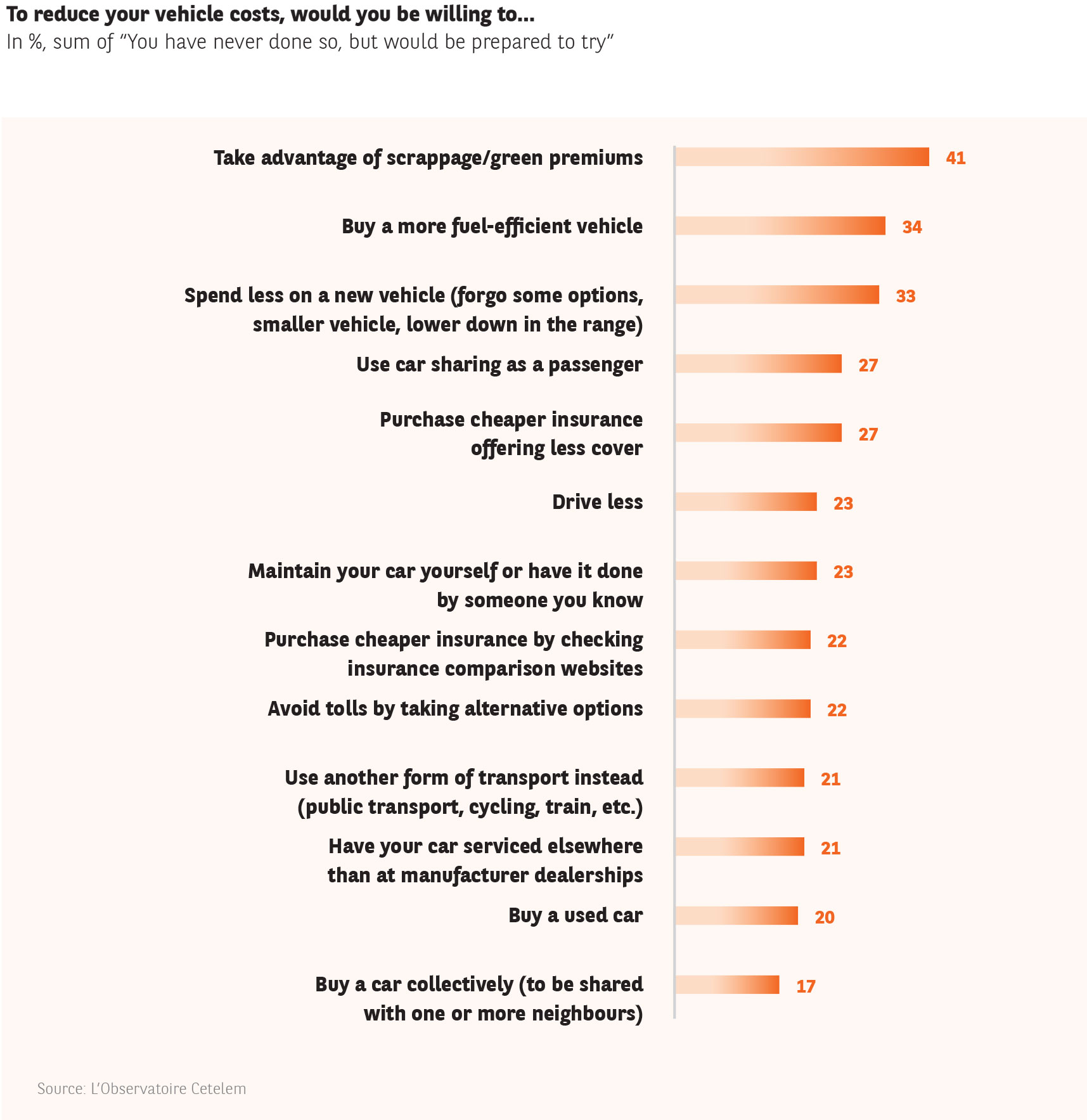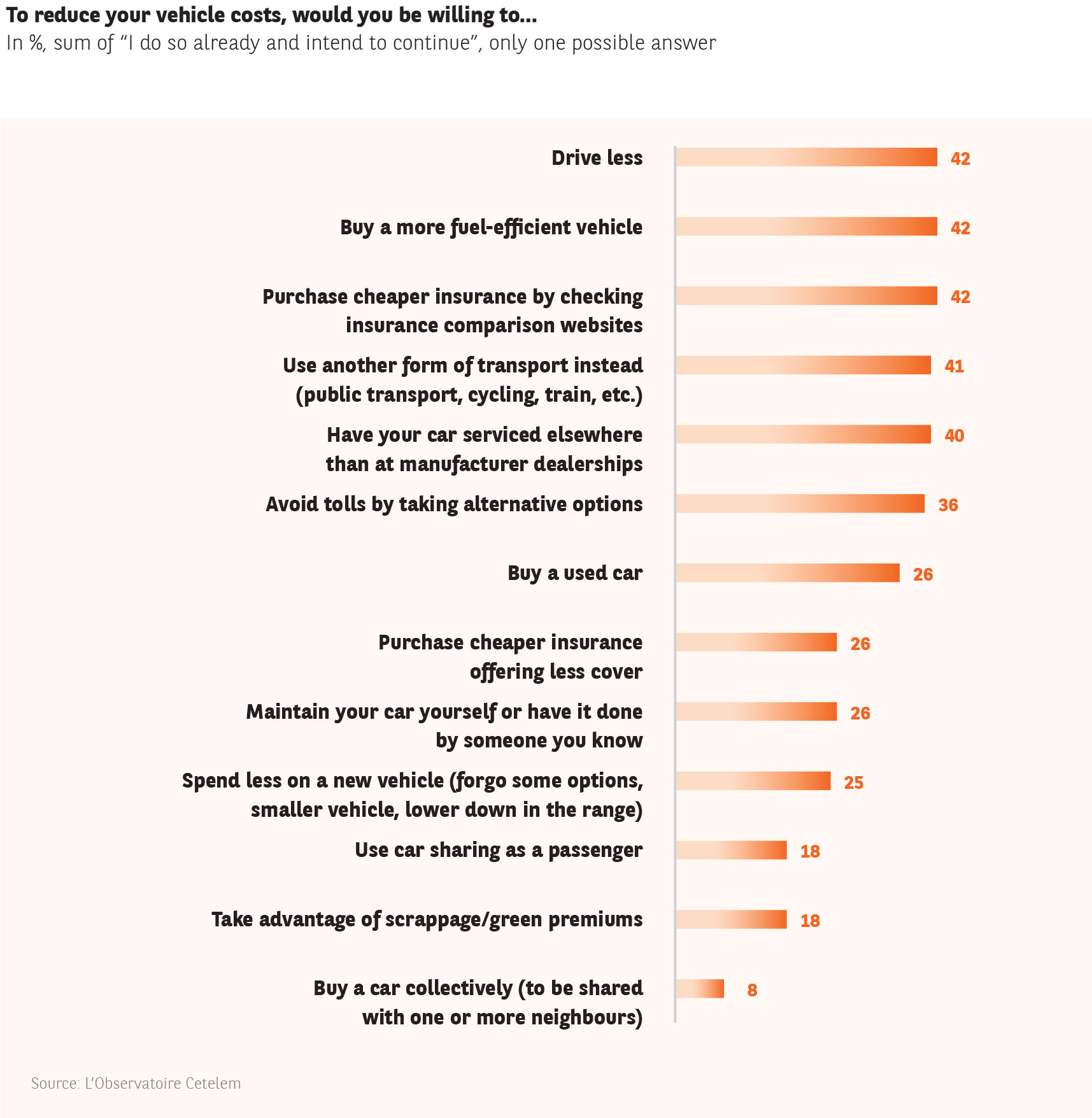 In order to face up to budgeting and financial issues, motorists have adopted various measures to reduce their motoring costs. 4 out of 10 drive less, with the Japanese being the most reluctant to reduce their mileage (26%).