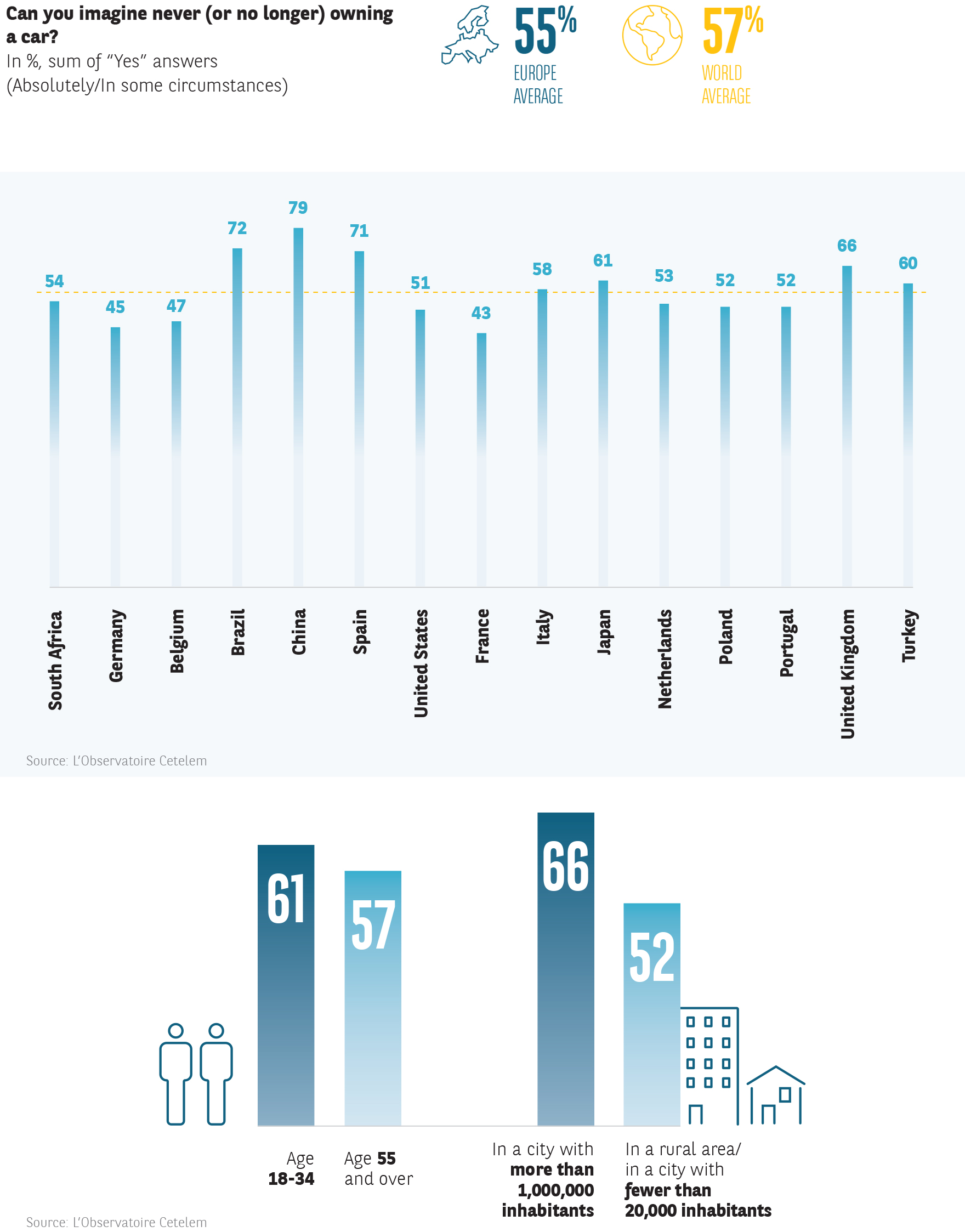Millennials are the least averse to considering living without a car, although there are differences between the countries. The majority of urbanites take this view.