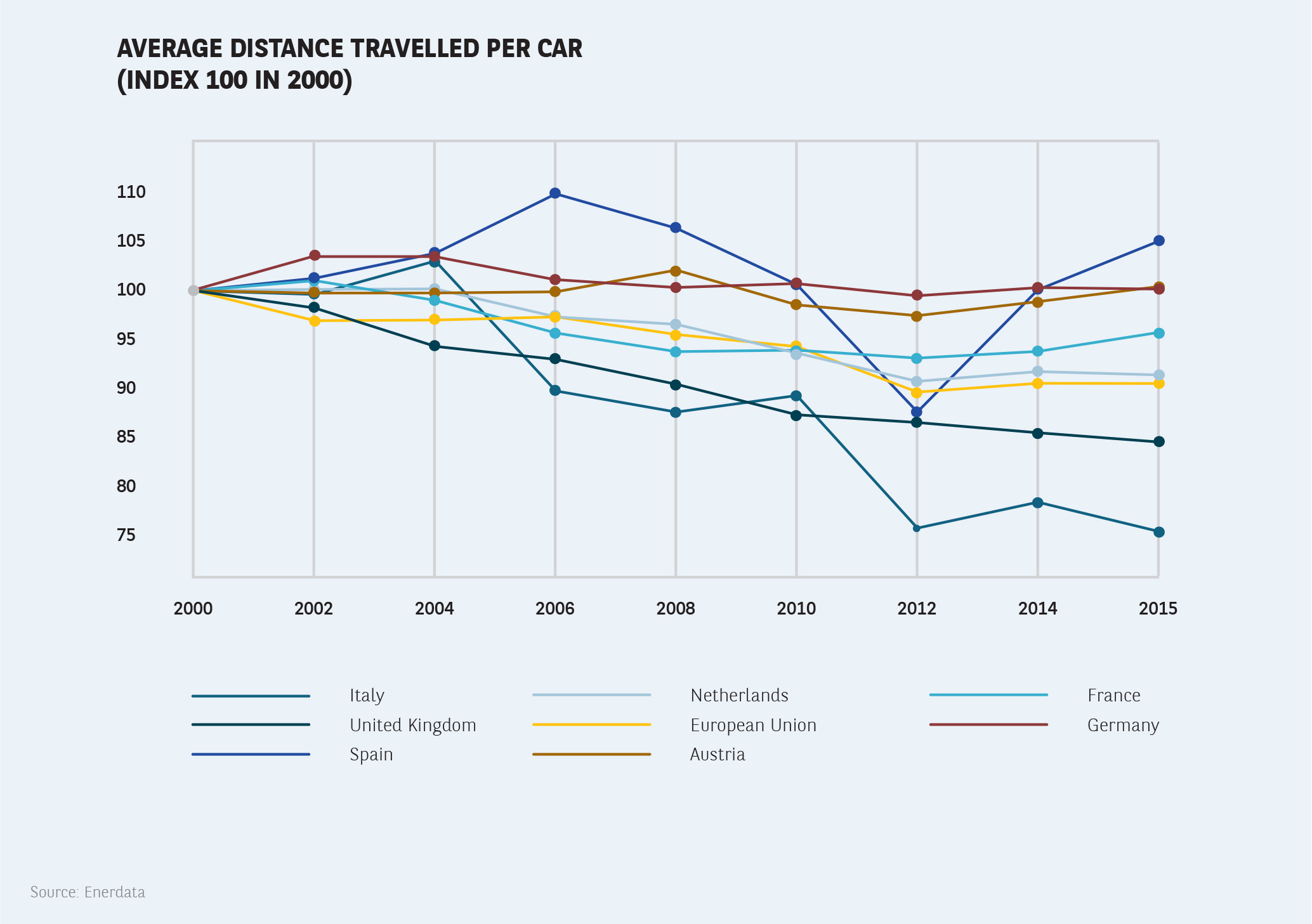 Having dropped steadily between 2000 and 2012, the distance travelled per car seems to have stabilized in many countries. It is even on the rise again in some (Spain, Austria, France). And while this increase in distances is due in part to lower fuel costs, it is nonetheless fresh evidence that cars remain essential, even if people are not prepared to own one at all costs.